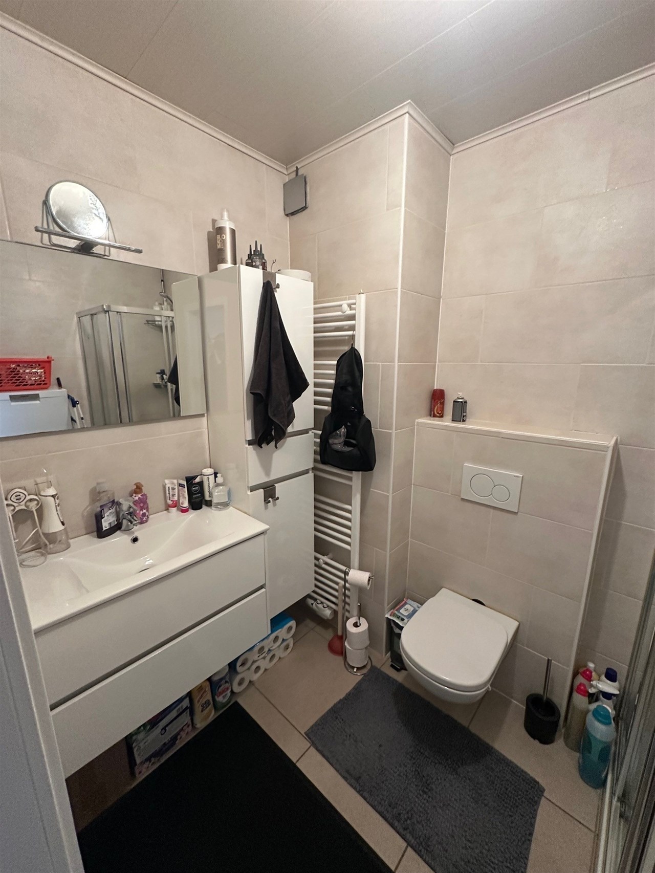 Het appartement beschikt over een inkomhal, een badkamer met douche en toilet, een slaapkamer, een ruime leefruimte en een aparte keuken. De verwarming gebeurt via centrale verwarming op aardgas en het energieverbruik bedraagt 132 kWh/m² volgens het EPC. Een overdekte autostaanplaats is inbegrepen. De huurprijs bedraagt 670 euro per maand, met bijkomende algemene onkosten van 30 euro per maand. De huurwaarborg bedraagt drie maanden huur en wordt gesteld via Korfine.