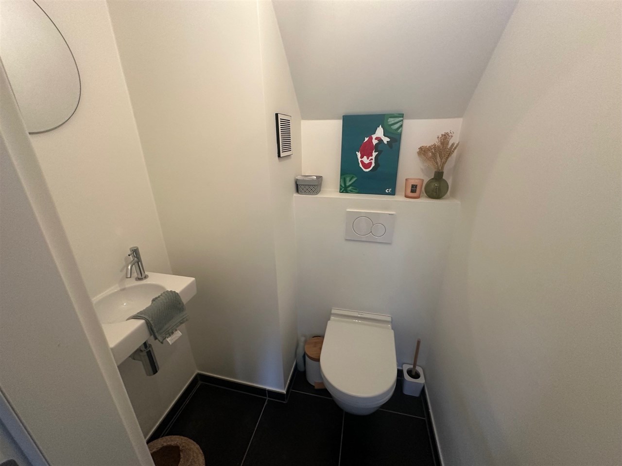 Op dit niveau bevindt zich de lichtrijke woonkamer met volledig geïnstalleerde open keuken, een apart toilet en een praktische bergruimte met aansluiting voor de wasmachine. Verder is er een slaapkamer en een badkamer uitgerust met lavabomeubel en ligbad.