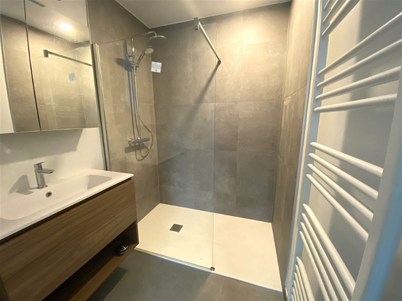 Het appartement beschikt over een apart toilet, bergruimte met aansluiting voor de wasmachine, grote leefruimte met veel lichtinval en open geïnstalleerde keuken met eiland. Voorts vinden we nog de moderne badkamer met grote inloopdouche en de twee slaapkamers terug. Het terras is toegankelijk via zowel de kleine slaapkamer als de leefruimte.
