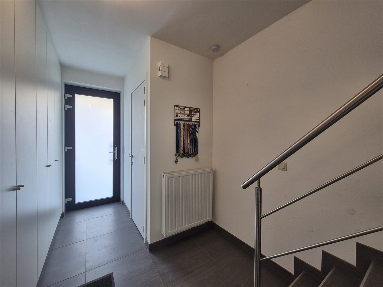 Je komt binnen via de inkomhal met ingebouwde kasten, waar ook een gastentoilet met lavabo is. Vanuit de inkomhal kan je naar de eerste verdieping of naar de ruime en lichtrijke leefruimte.