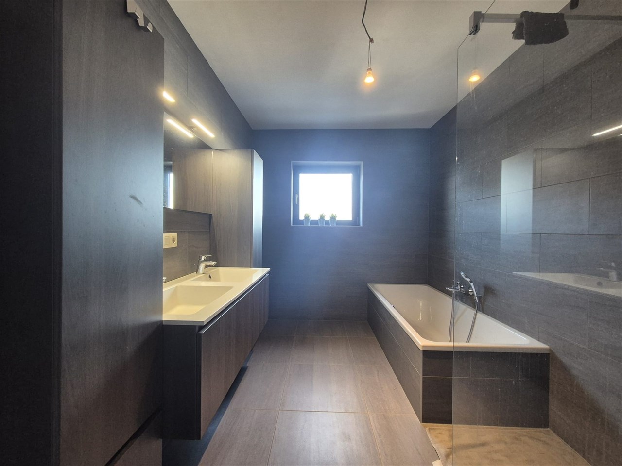 De badkamer is ingericht met een dubbele lavabo met meubel, ligbad en inloopdouche, en er is ook een apart toilet.