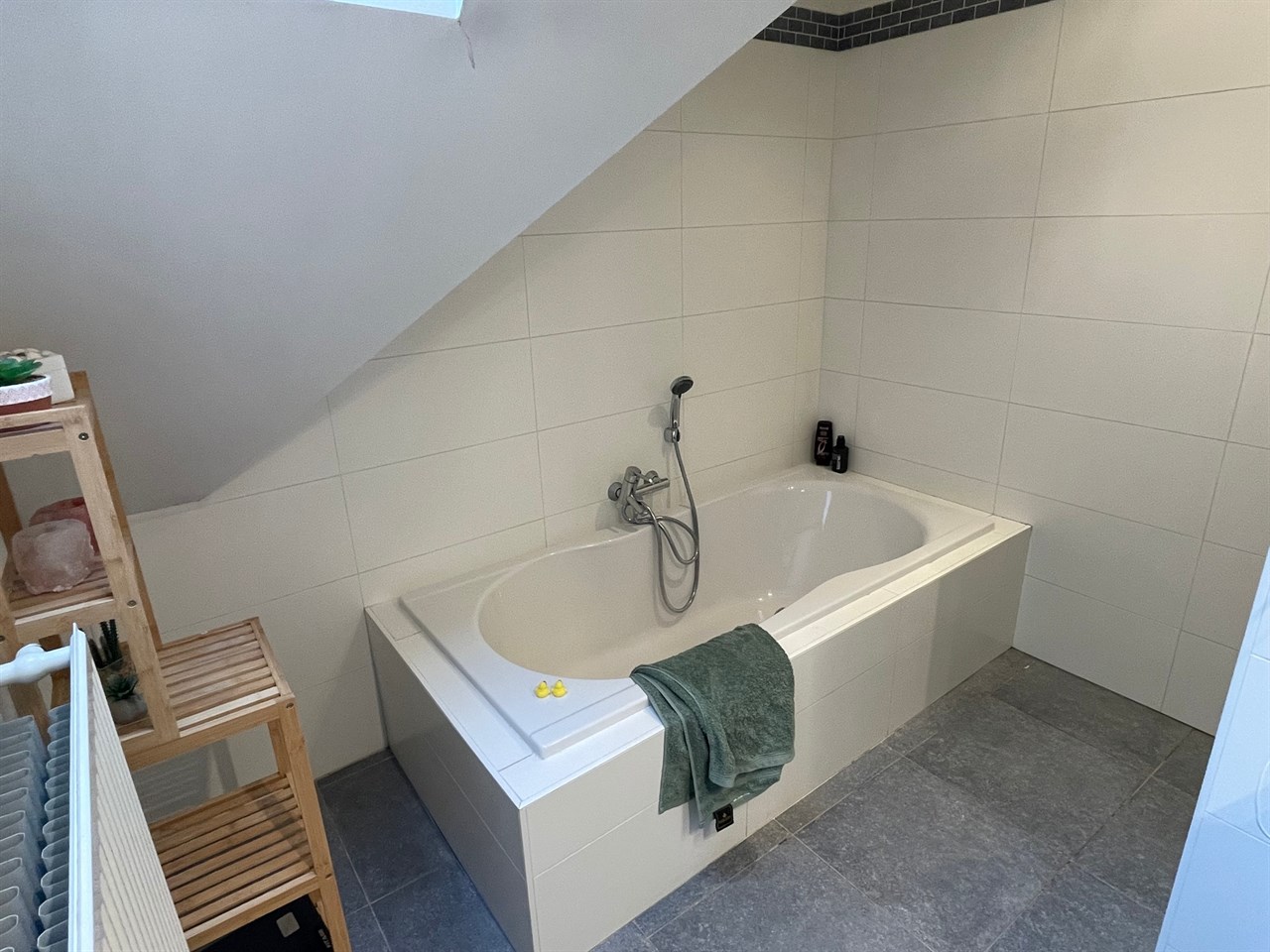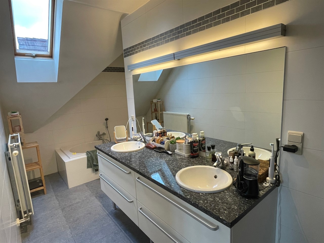 Ingerichte badkamer met ligbad, douche, dubbel lavabomeubel.