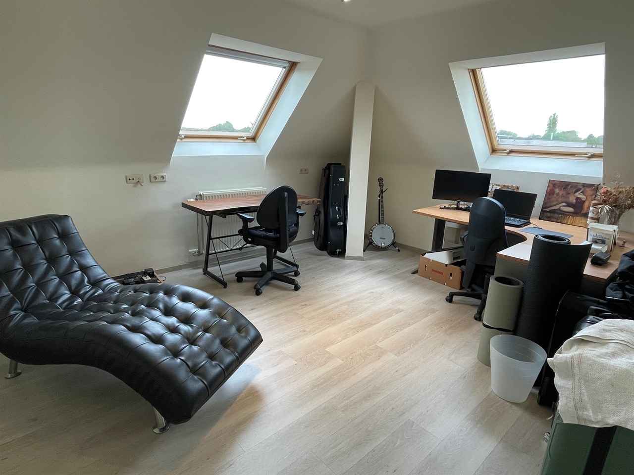 2e verdiep: ruime hal, 2 slaapkamers, bureau ruimte en badkamer met douche, lavabo, toilet.