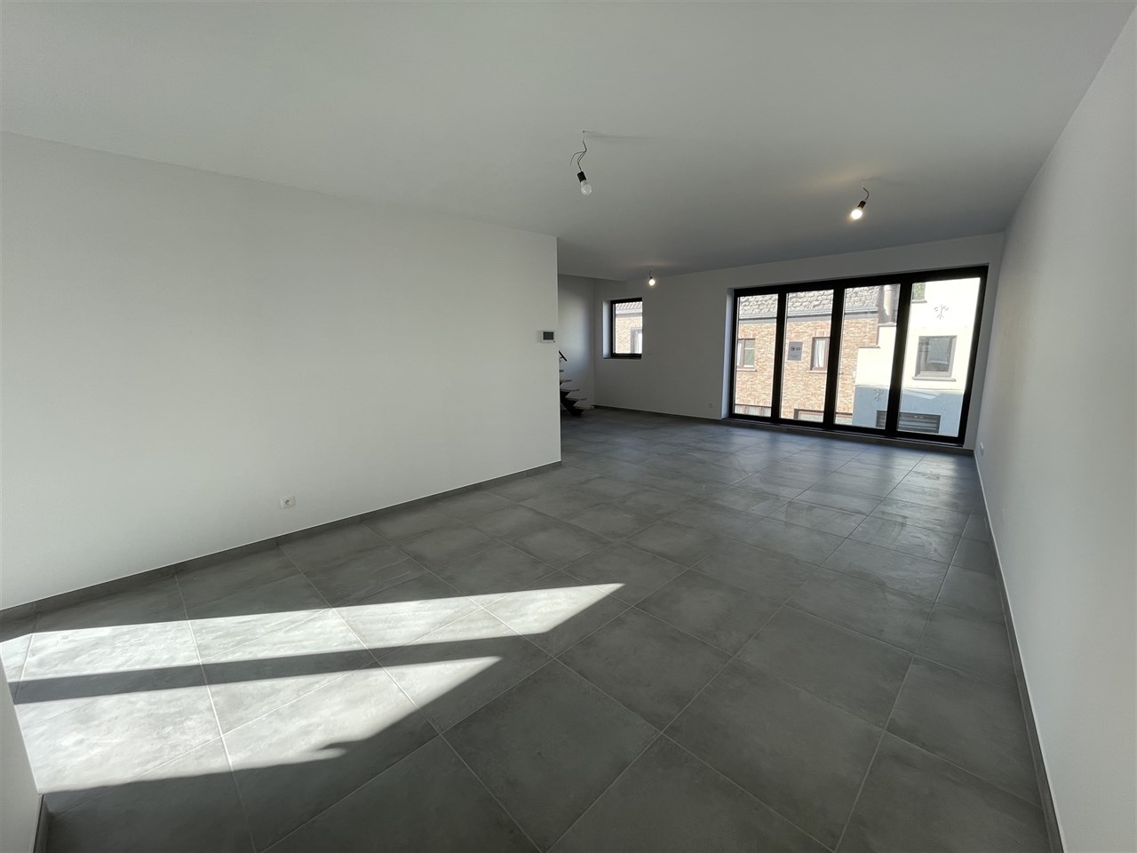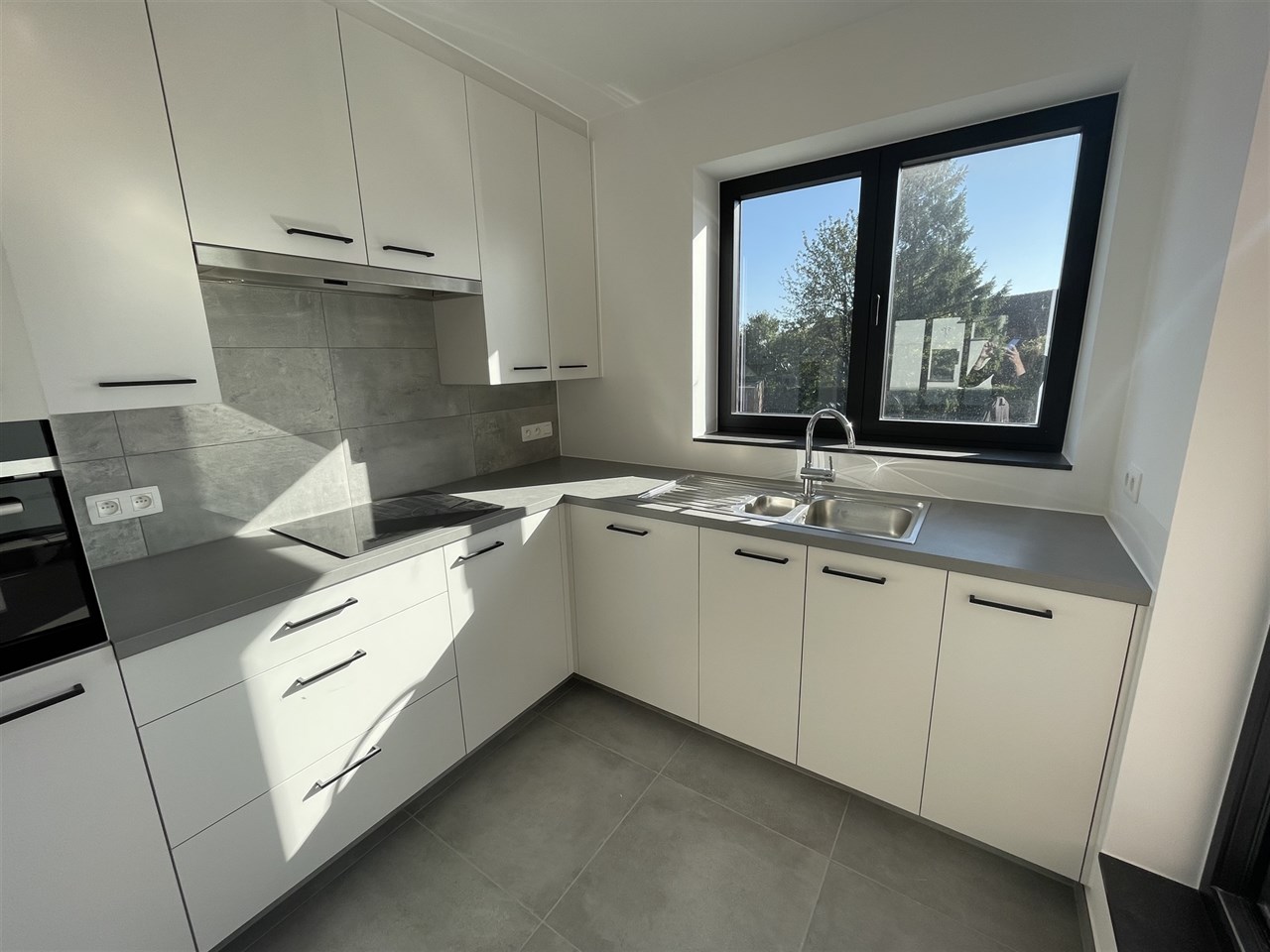 Inkomhal, apart toilet met lavabo, ruime woonkamer met veel lichtinval, open keuken voorzien van frigo, keramische kookplaat, dampkap, combi oven, vaatwasser.