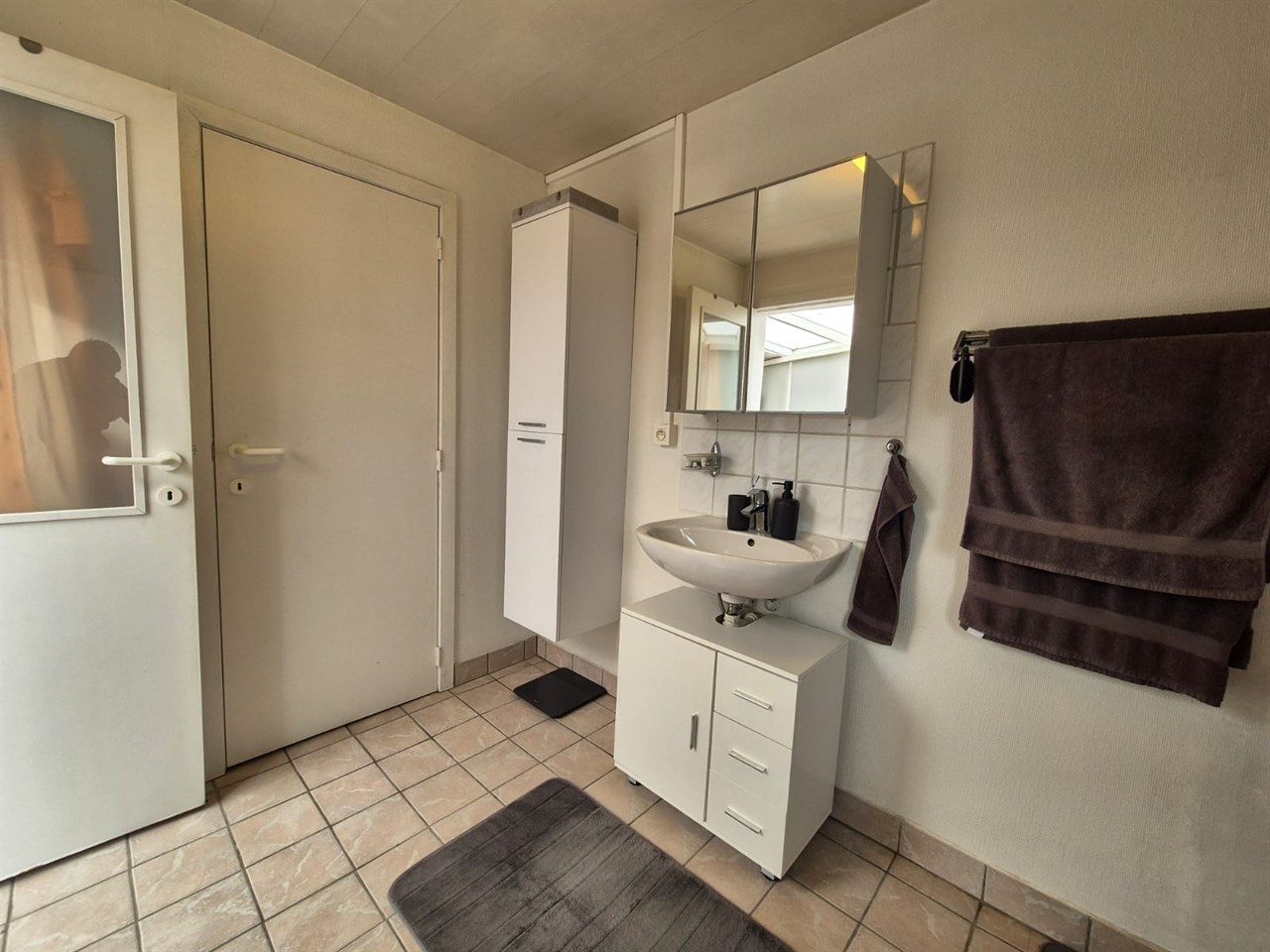 Ingerichte badkamer met douche en lavabo, afzonderlijk toilet, berging.