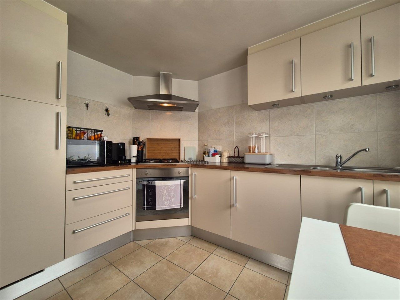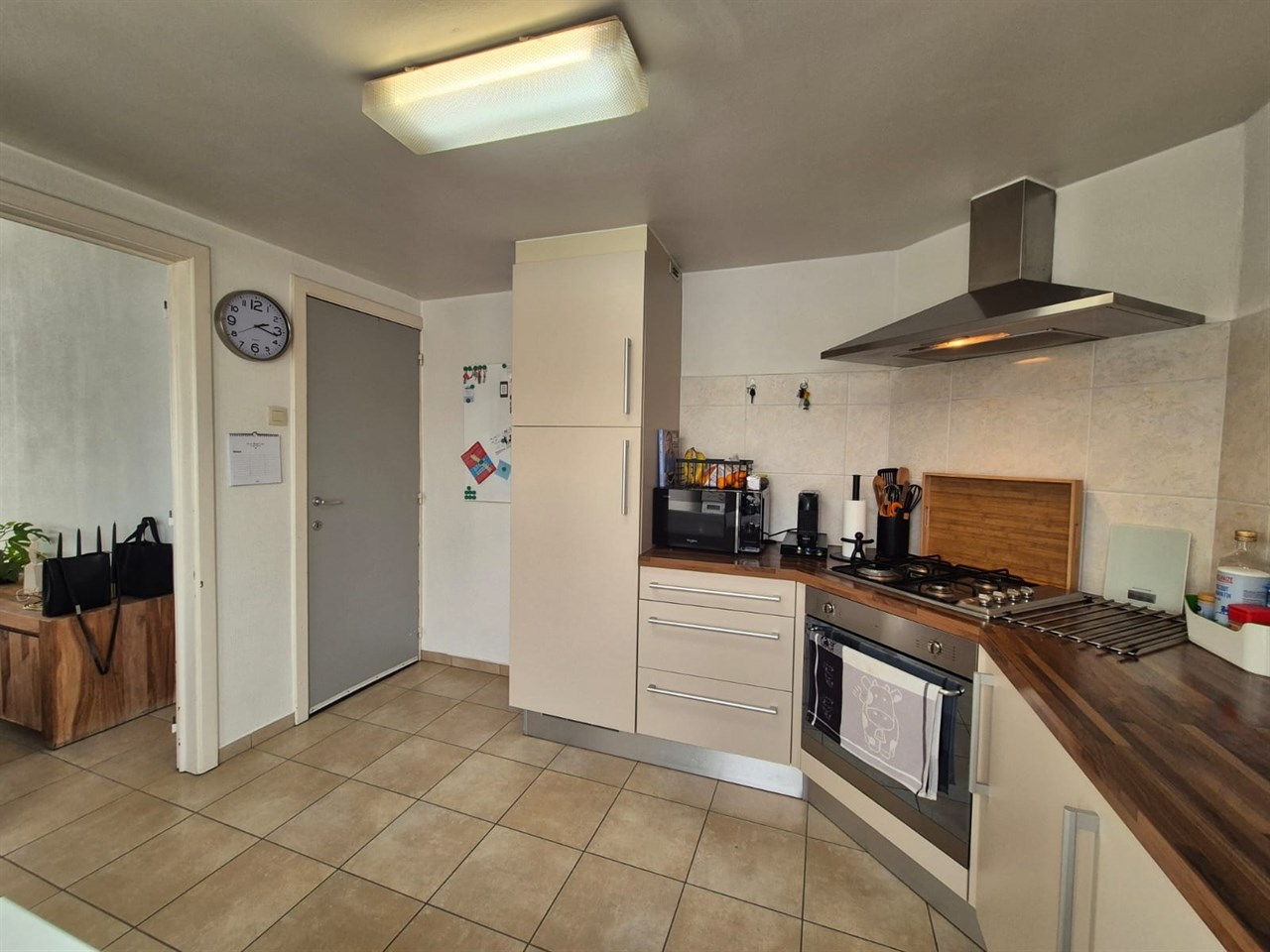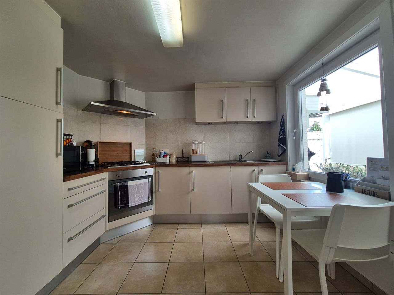 Inkomhal, living, recent ingerichte keuken voorzien van kookplaat, oven en dampkap, veranda.