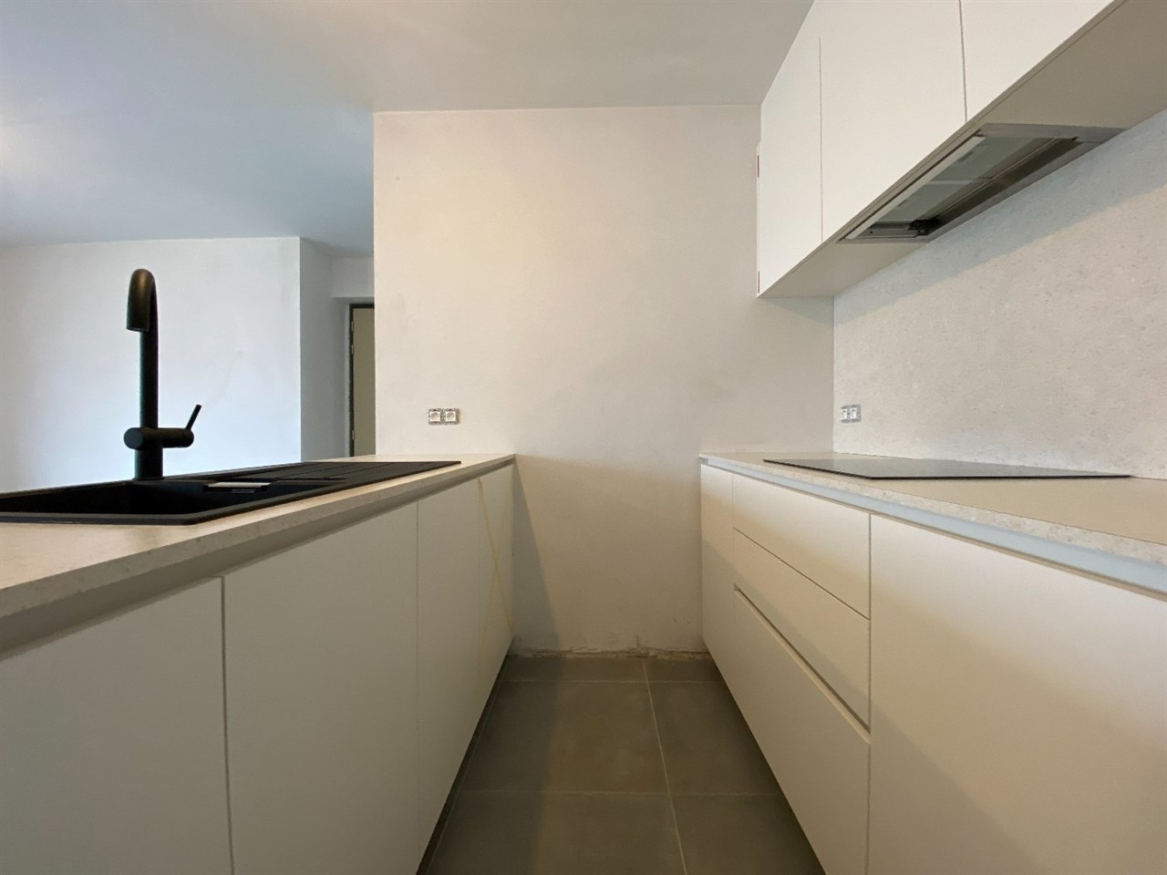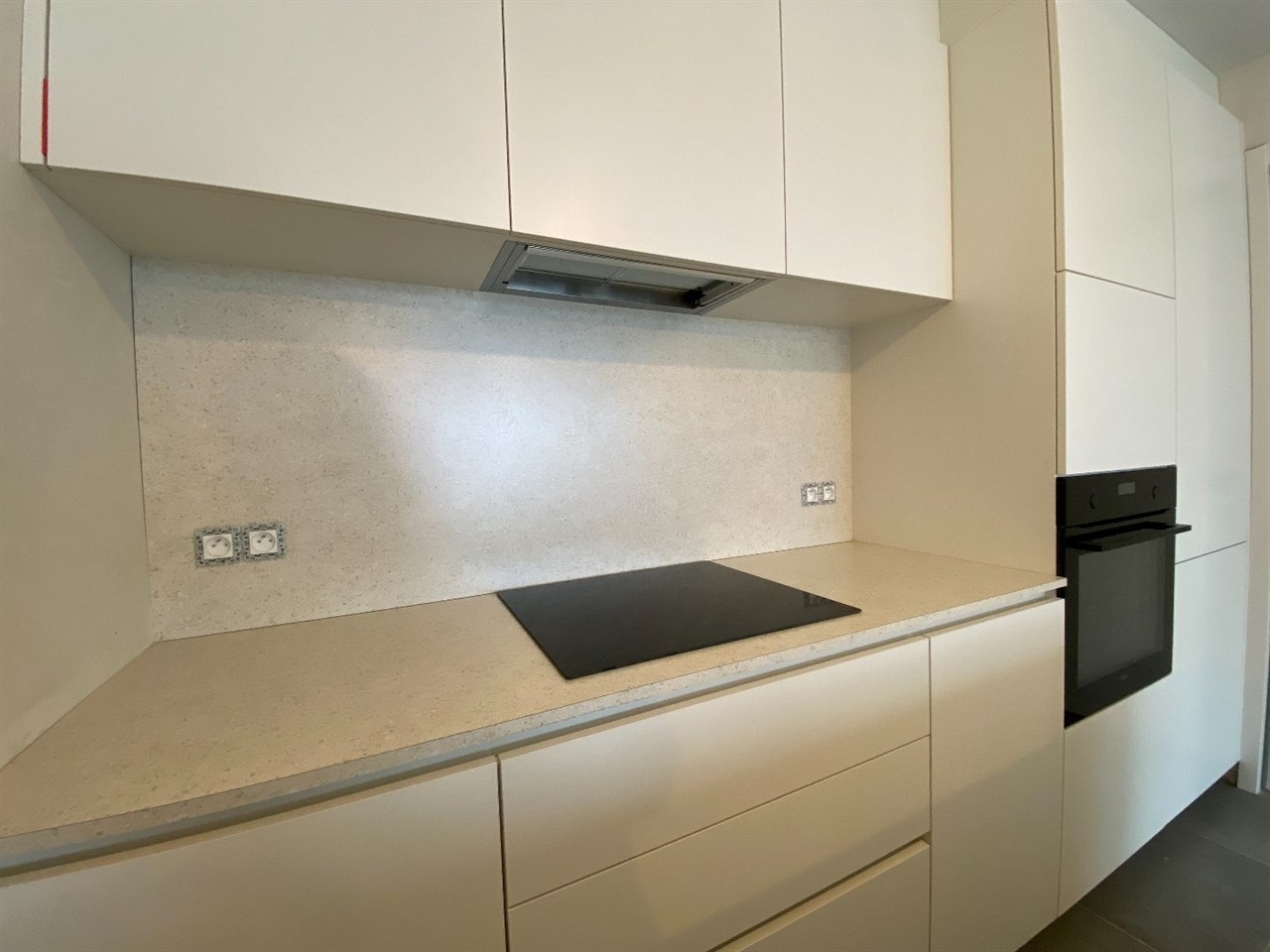 Lichtrijke leefruimte met praktische, open keuken voorzien van inductiekookplaat, vaatwasser en oven. Vanuit de leefruimte kan u naar het privé terras vooraan