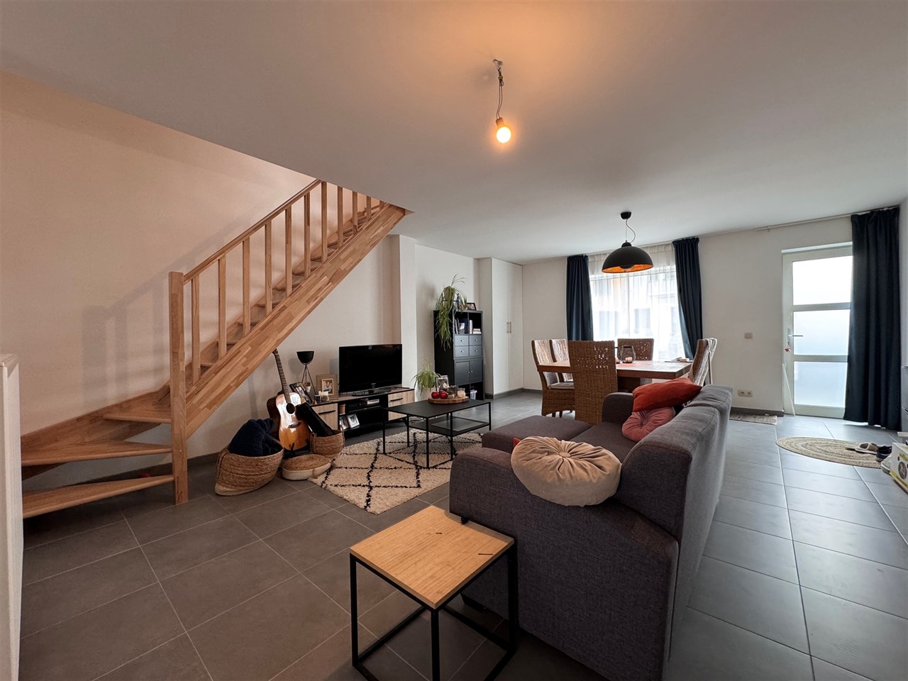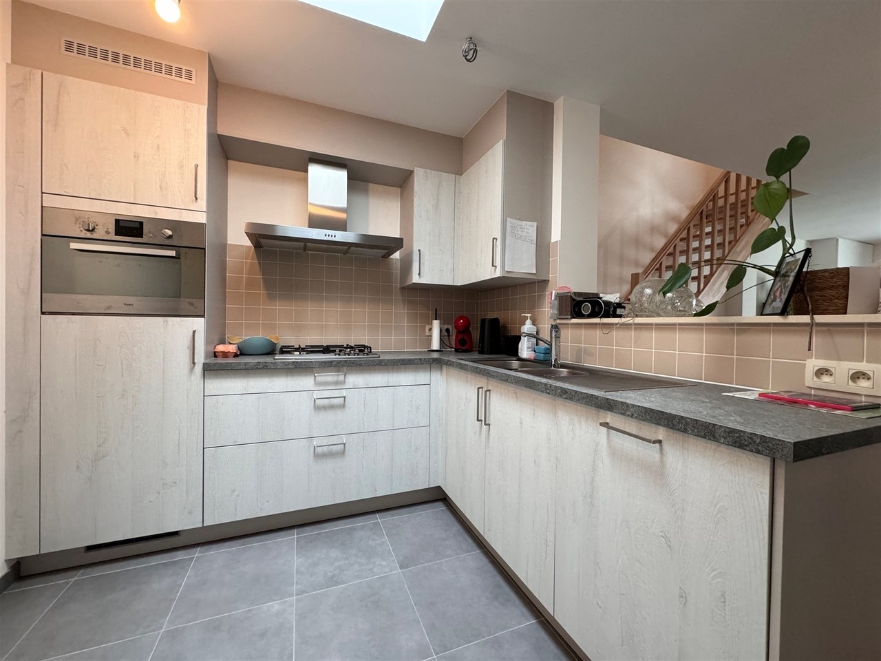 Ruime lichtrijke leefruimte met open keuken die voorzien is van een gaskookplaat, frigo, oven en vaatwasser.