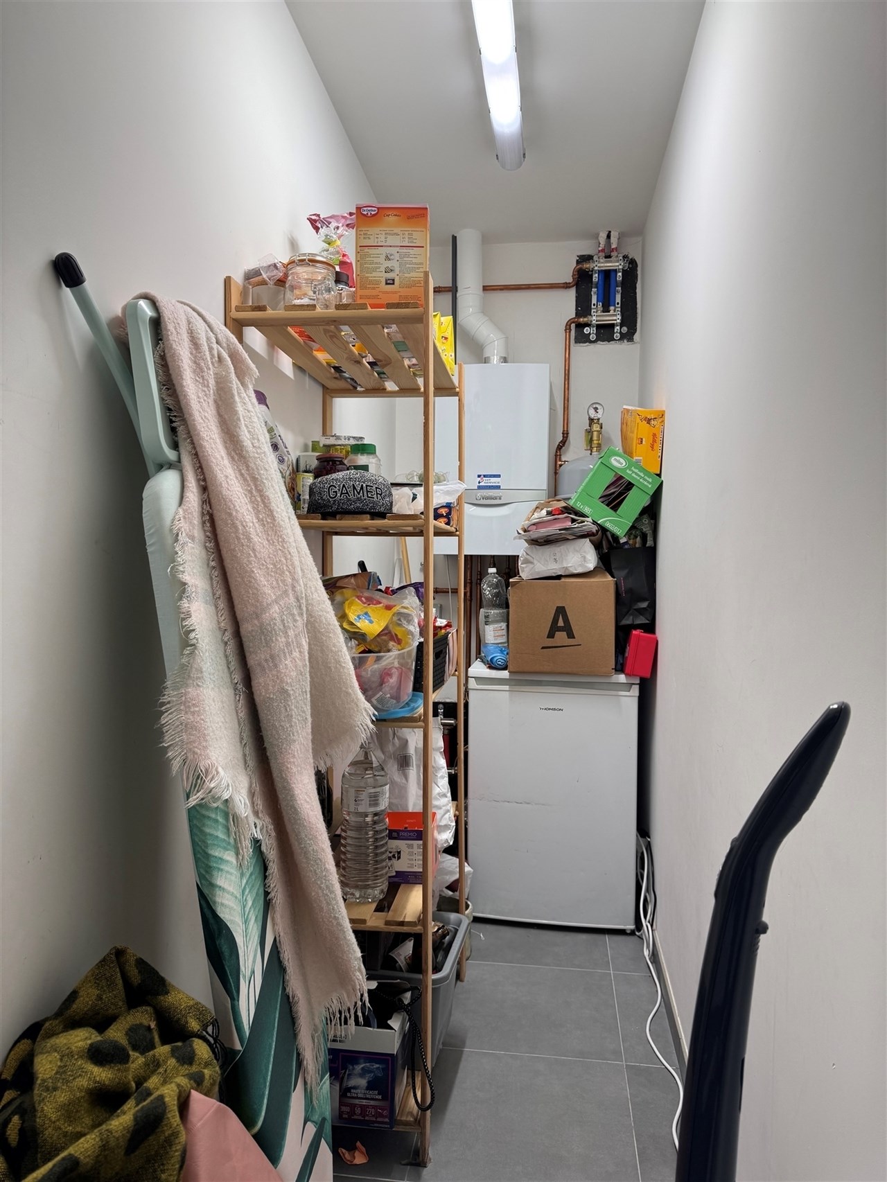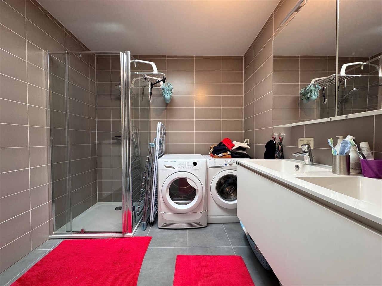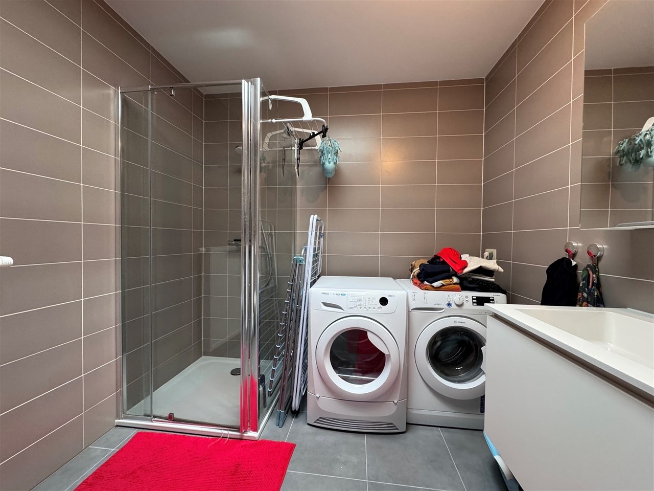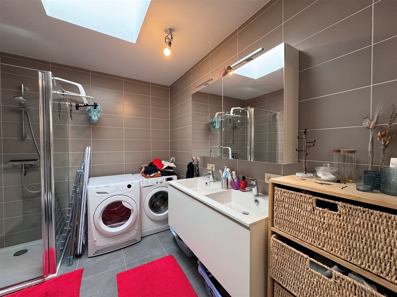 Achtergelegen vinden we de badkamer die voorzien is van een dubbel badkamermeubel, douche, toilet en plaats voor wasmachine en droogkast.