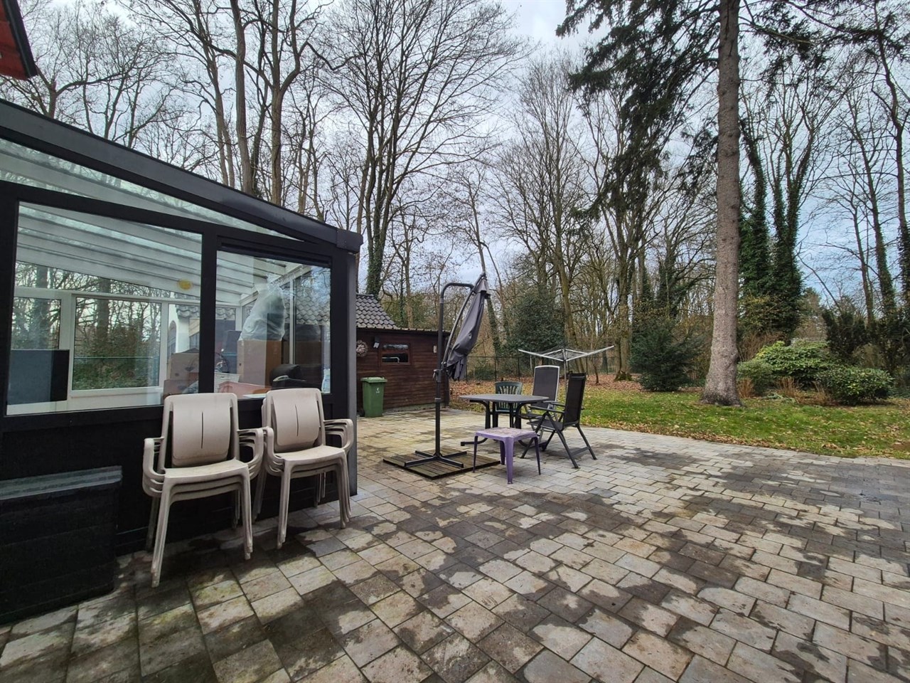 Vanuit de woonkamer heeft u toegang tot een ruime veranda, waar u het hele jaar door van het uitzicht op de tuin kunt genieten.