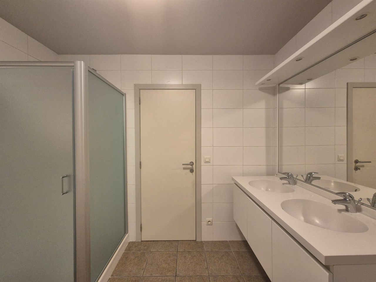 De badkamer is uitgerust met een douche en een dubbele lavabo met meubel.