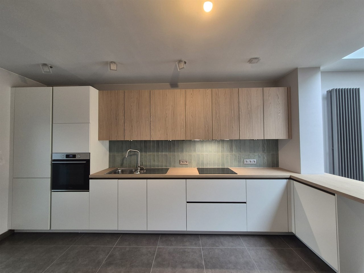 Aansluitend bevindt zich een zeer lichtrijke leefruimte met grote raampartijen die zorgen voor een aangename connectie met buiten en rechtstreekse toegang geven tot het mooi terras, waar u in alle rust kan genieten.