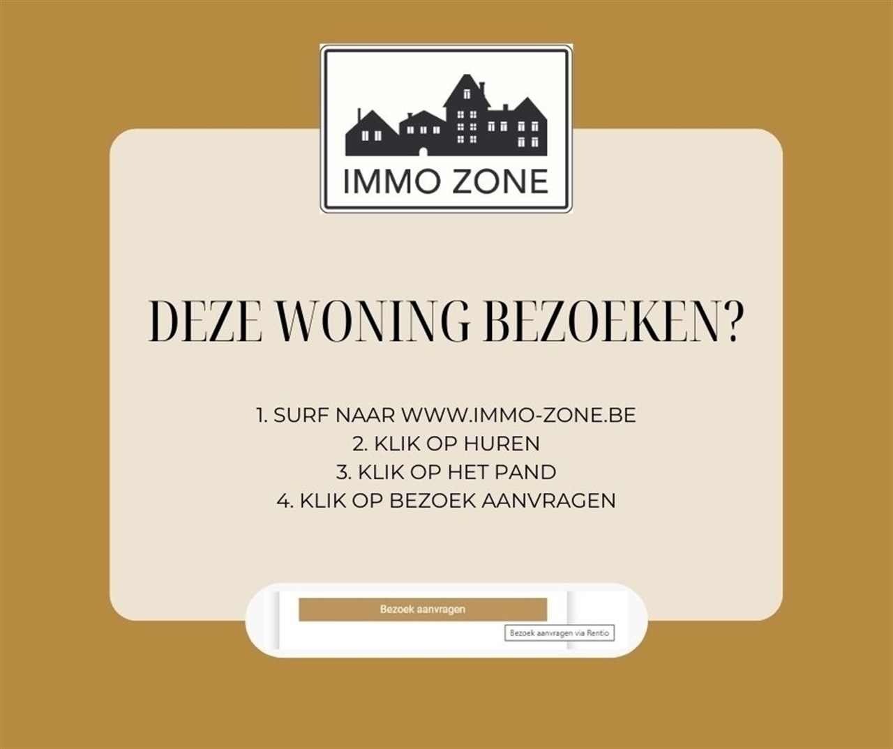Klik op BEZOEK AANVRAGEN op onze website (www.immo-zone.be) en boek online uw afspraak in.