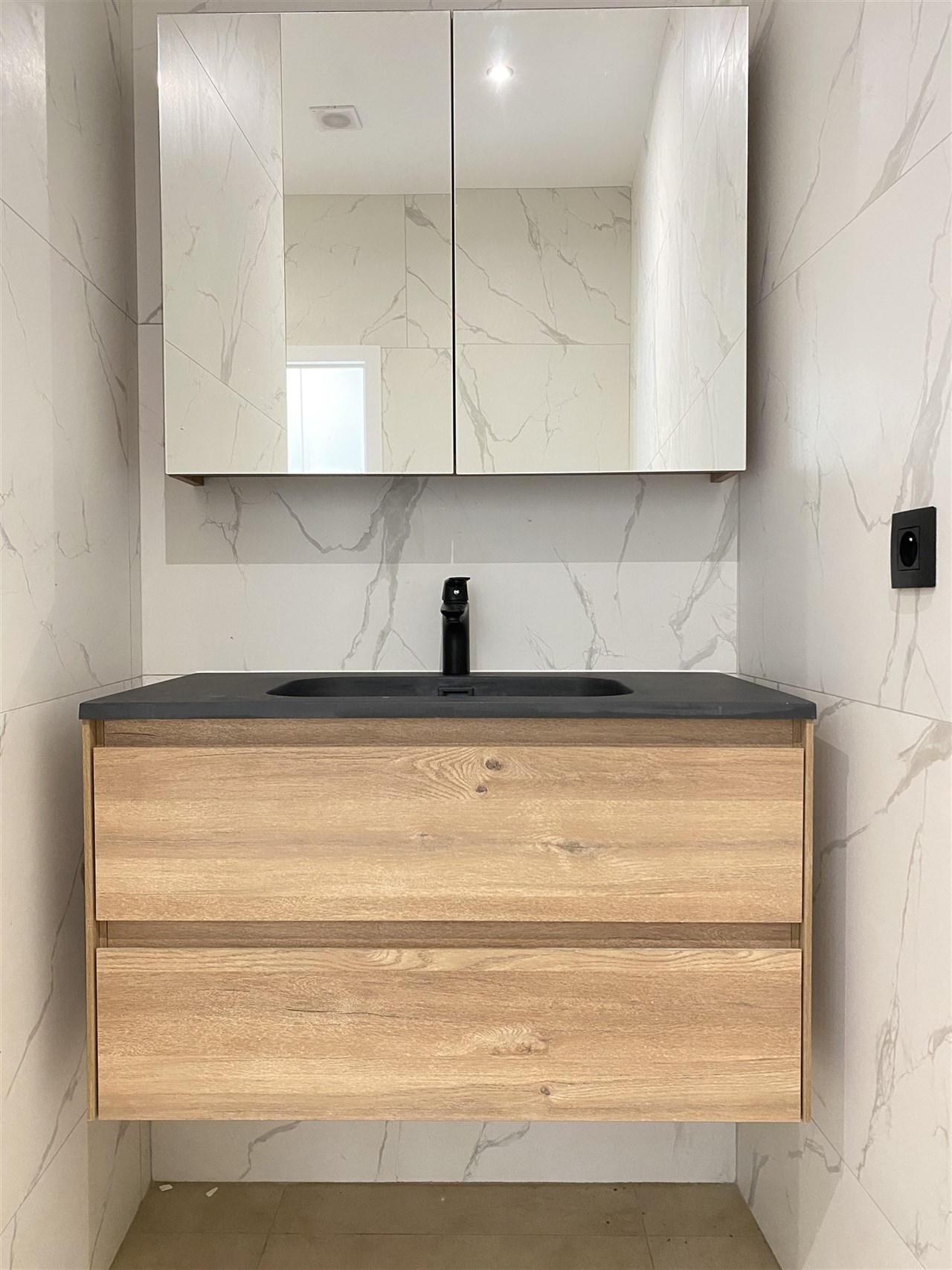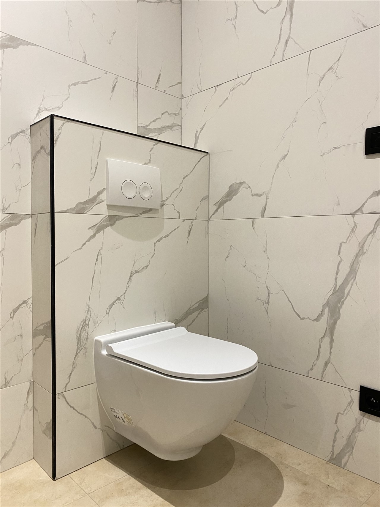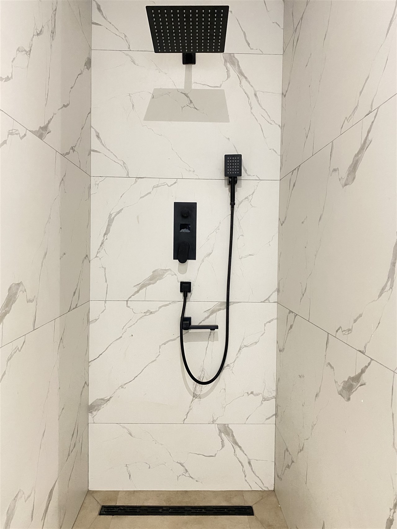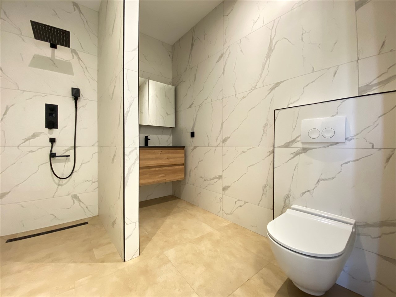 Aangrenzend aan deze ruimte bevindt zich een moderne volledig betegelde badkamer met een inloopdouche, een wastafel met meubel en een hangtoilet.
