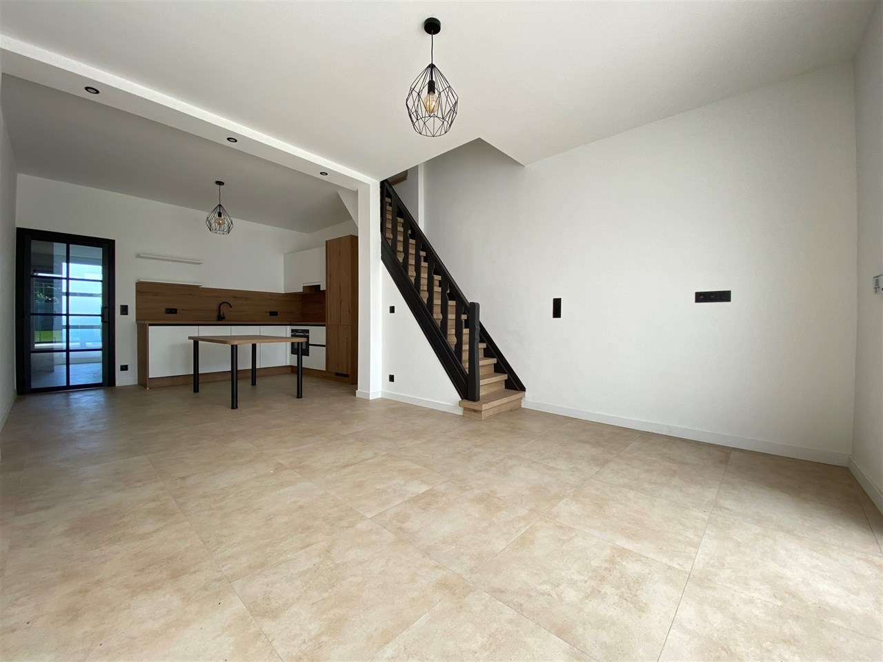 Vanuit de inkomhal kom je direct in een open en lichtrijke leefruimte. Deze ruimte is smaakvol ingericht en biedt voldoende plaats voor een comfortabele zithoek en een eettafel.