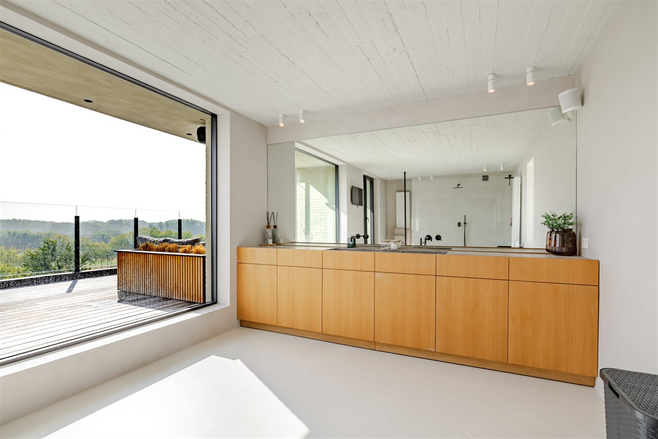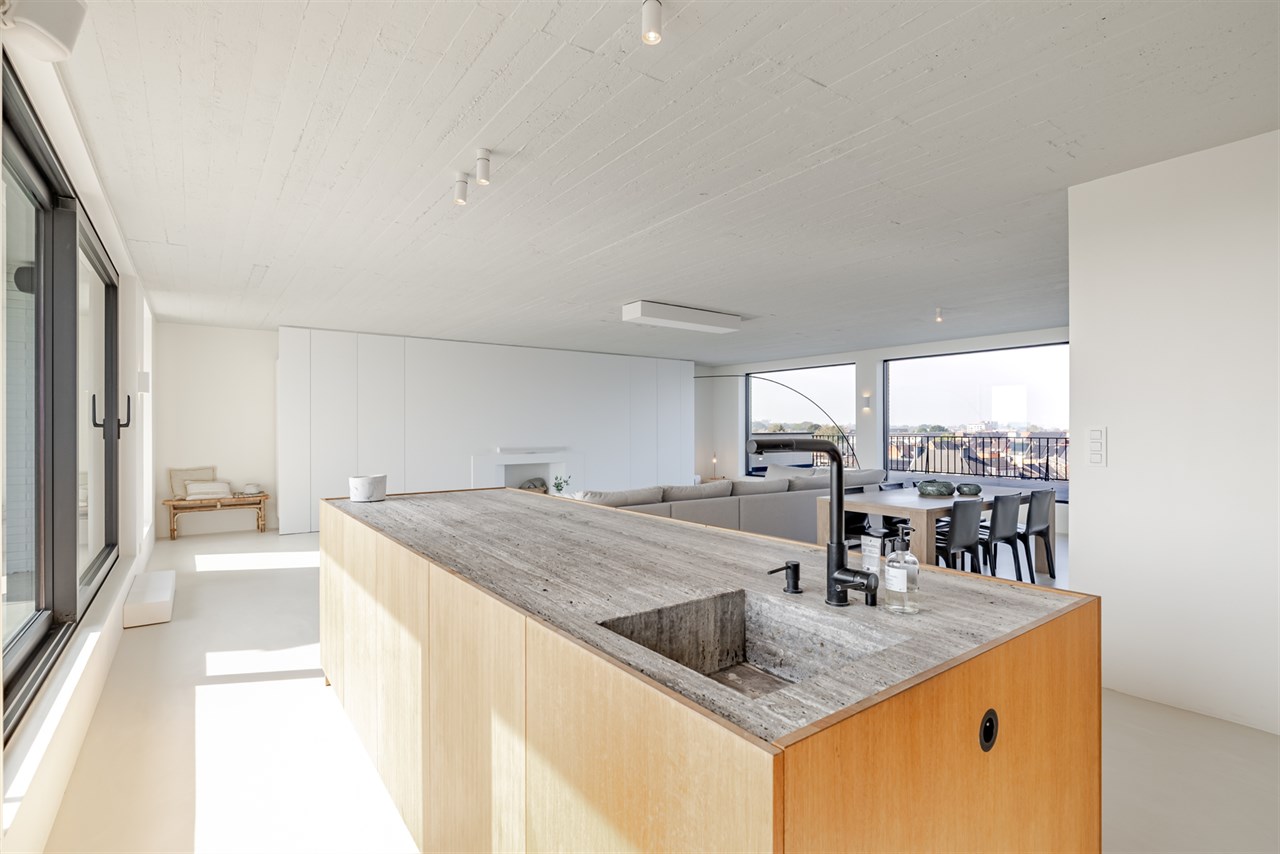 De royale leefruimte baadt in natuurlijk licht dankzij de grote raampartijen en vormt het kloppende hart van het penthouse. De open, volledig uitgeruste designkeuken is een droom voor elke kookliefhebber en beschikt over een praktische bijkeuken voor extra opslag en functionaliteit.