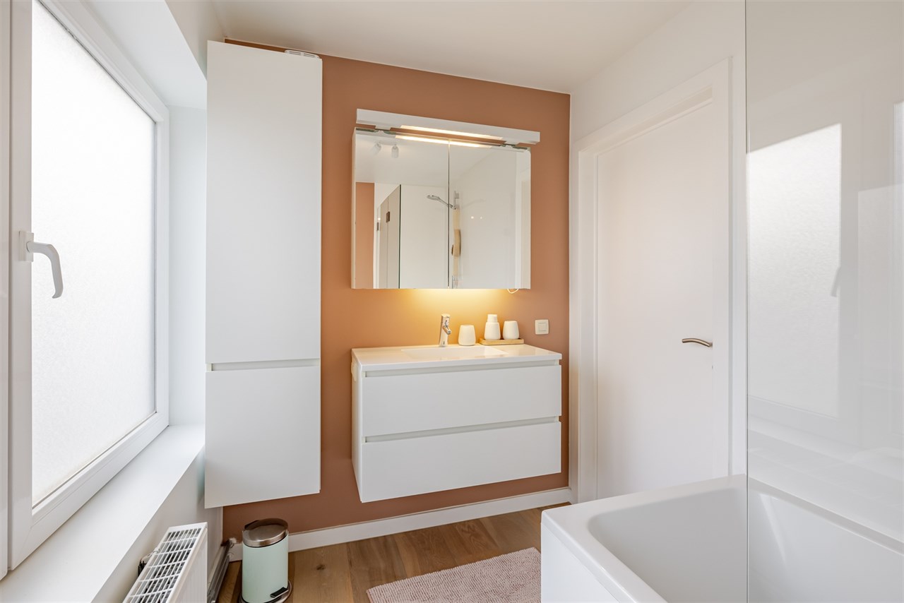 Via de inkomhal, voorzien van vestiaire en gastentoilet, kom je in het woongedeelte. Op de bovenverdieping bevinden zich drie ruime slaapkamers en een elegante badkamer met bad-douchecombinatie, dubbele wastafel en toilet. Een extra berging biedt bijkomende opbergruimte.