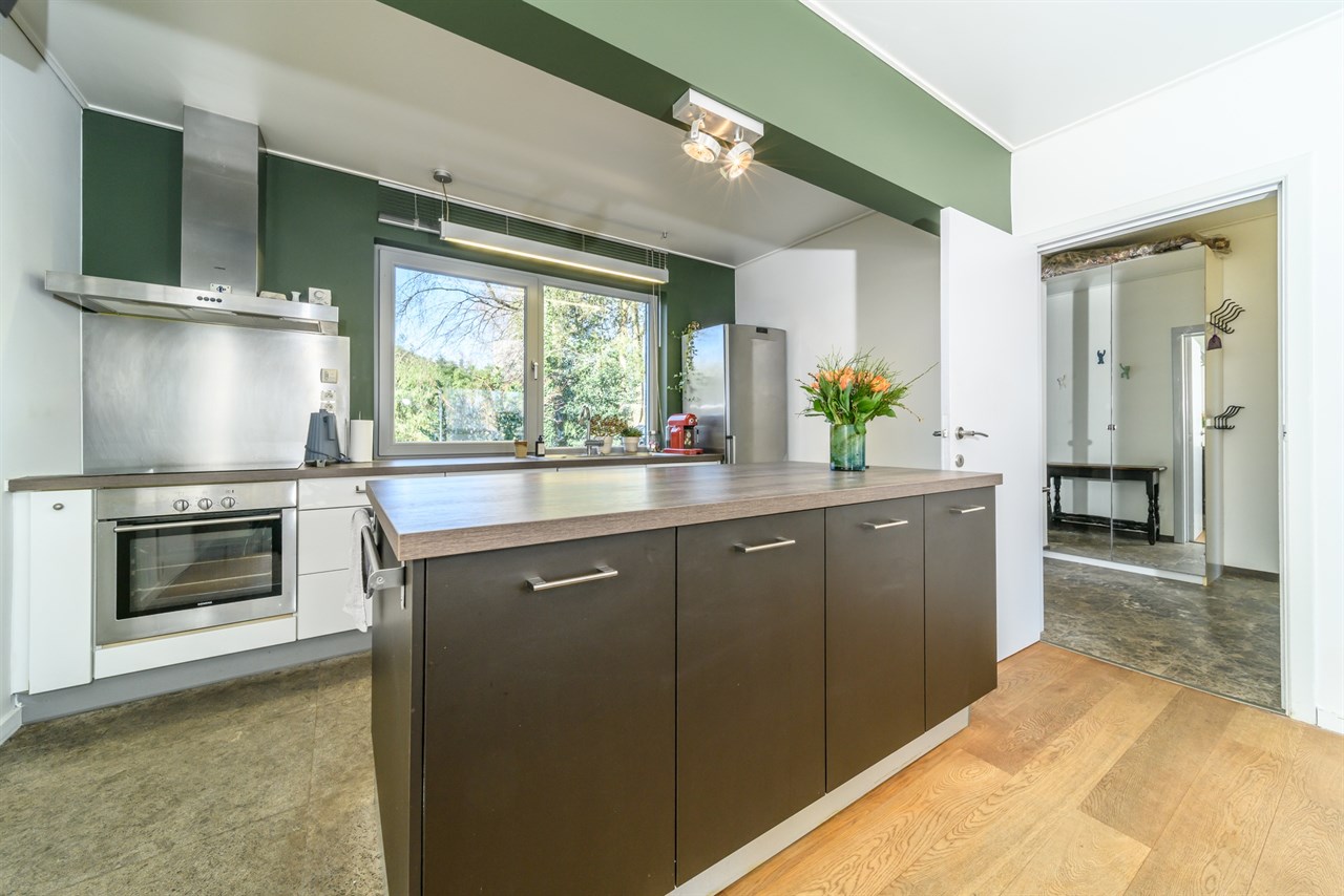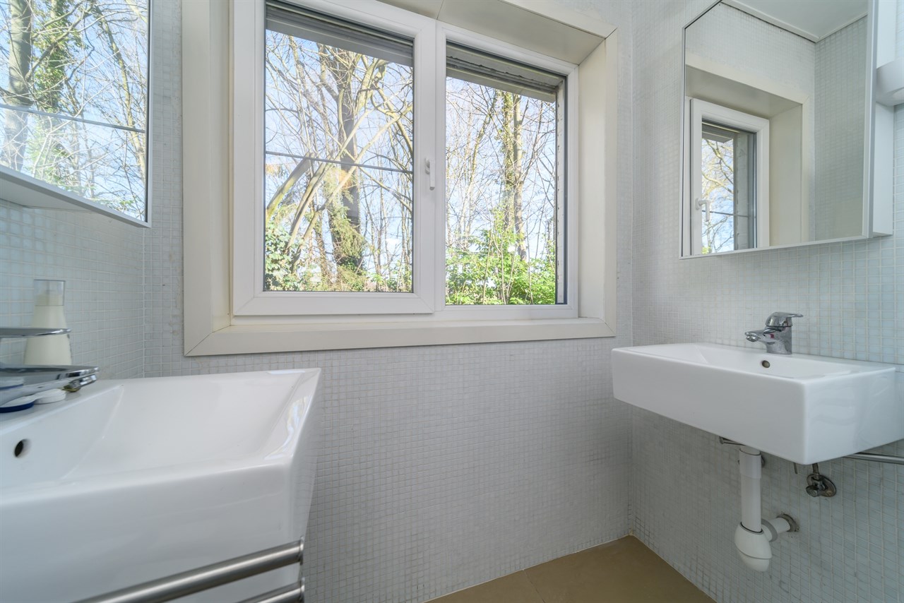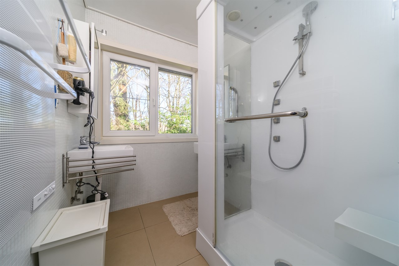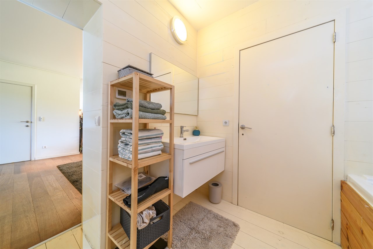 Via de inkomhal met gastentoilet betreedt u de lichtrijke leefruimte met open, volledig geïnstalleerde keuken, die samen het warme hart van de woning vormen. Grote raampartijen bieden een prachtig zicht op de tuin en versterken het gevoel van binnen-buitenleven. Aansluitend bevindt zich een praktische garage of berging met annex een badkamer uitgerust met ligbad en lavabo, evenals een aparte wasplaats. Naast de leefruimte is een bureaugedeelte voorzien met zicht op het groen, ideaal voor wie comfortabel van thuis uit wenst te werken. Verder beschikt de woning over twee volwaardige slaapkamers en