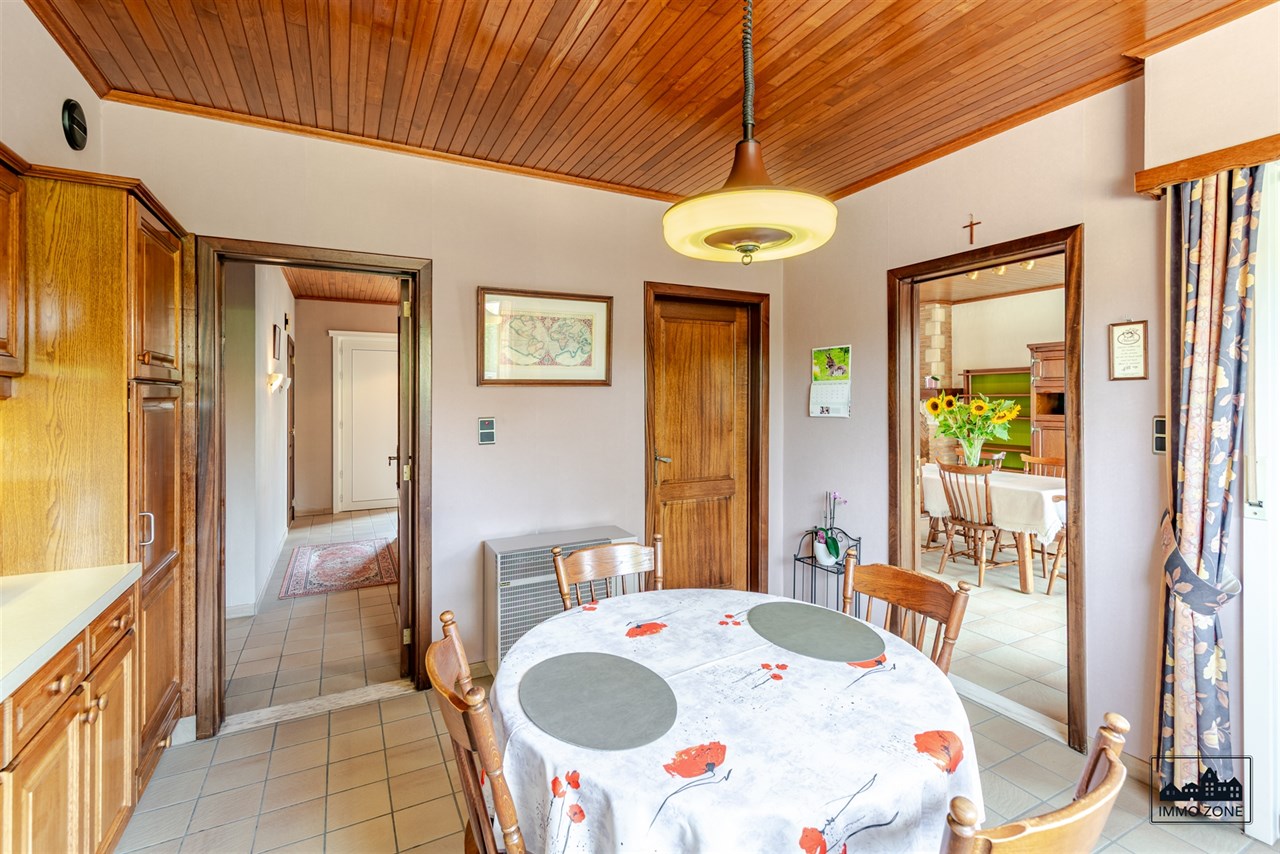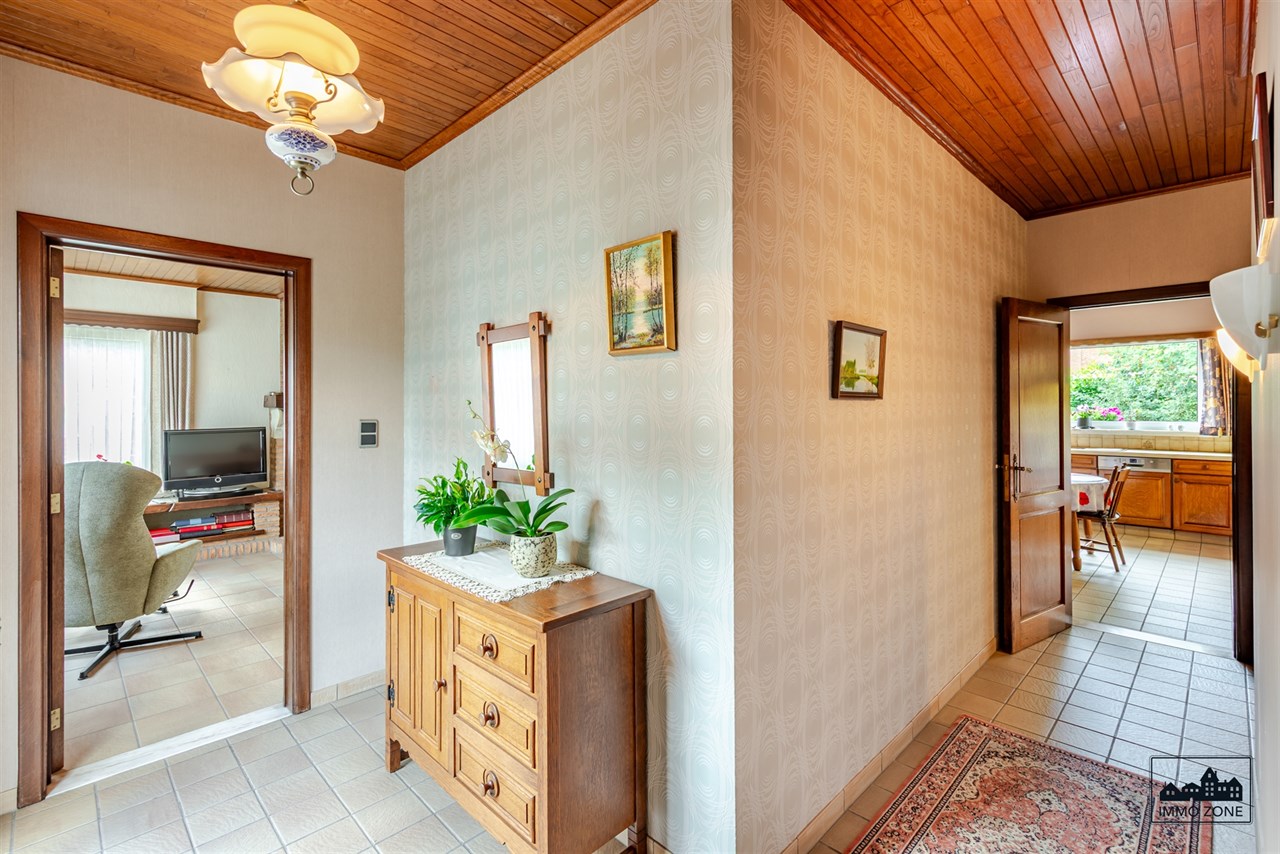 U betreedt de woning via een royale inkomhal, die toegang biedt tot de gezellige leefruimte met uitzicht op de tuin. Aansluitend bevindt zich de volledig uitgeruste keuken, die kan worden afgesloten van de leefruimte en directe toegang biedt tot het overdekte terras – ideaal om in alle seizoenen van uw tuin te genieten.