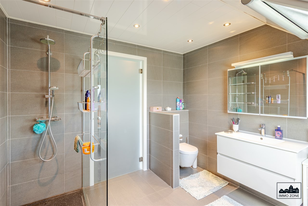De woning beschikt tevens over een inpandige garage met toegang tot een grote berging, waar plaats is voor een wasmachine en droogkast. Hier is bovendien nog een extra douche en toilet voorzien, wat voor extra comfort zorgt. Vanuit deze ruimte kan u direct terecht in de ruime, gezellige tuin.