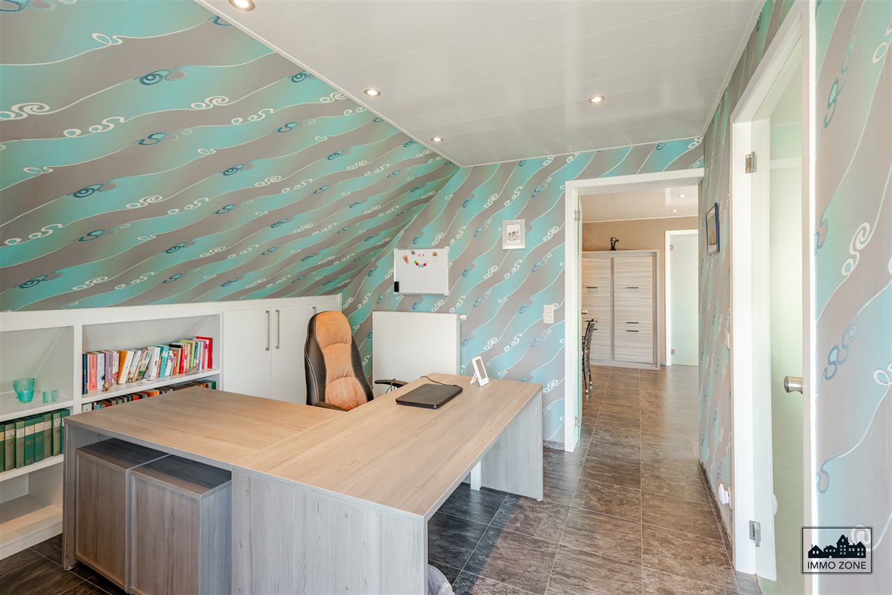 Op de eerste verdieping bevindt zich een ruime bureauruimte en een tweede badkamer met inloopdouche, toilet en enkele wastafel. Daarnaast vindt u hier een gezellige leefruimte, een aparte ruime slaapkamer (16 m2) met dressing, én nog een extra ruime slaapkamer (15m2).