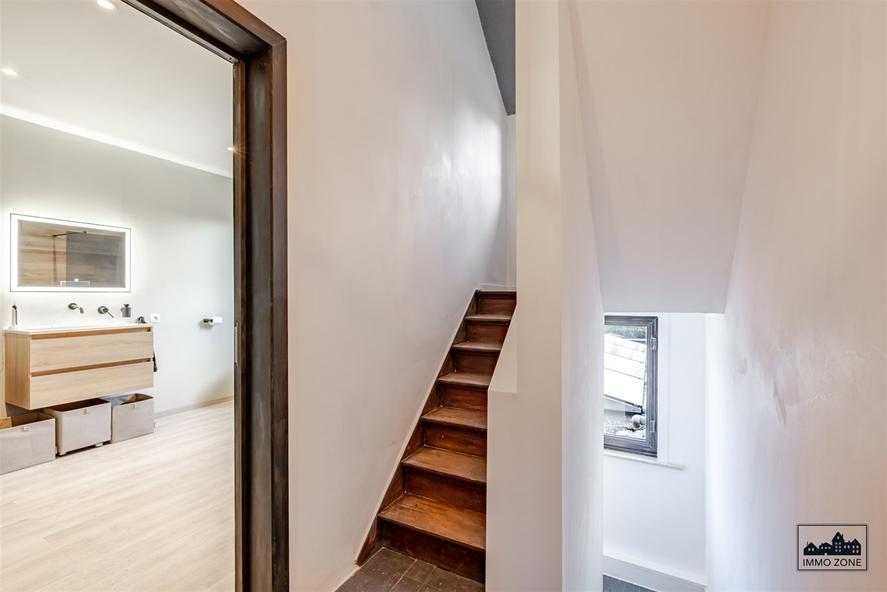 Op de eerste verdieping vind je een stijlvolle badkamer met inloopdouche en toilet, en een ruime slaapkamer die nu ingericht is als dressing en bureau. Ideaal voor wie thuis werkt of graag extra bergruimte heeft. De vaste trap leidt je naar de afgewerkte zolderverdieping, ingericht als comfortabele tweede slaapkamer.