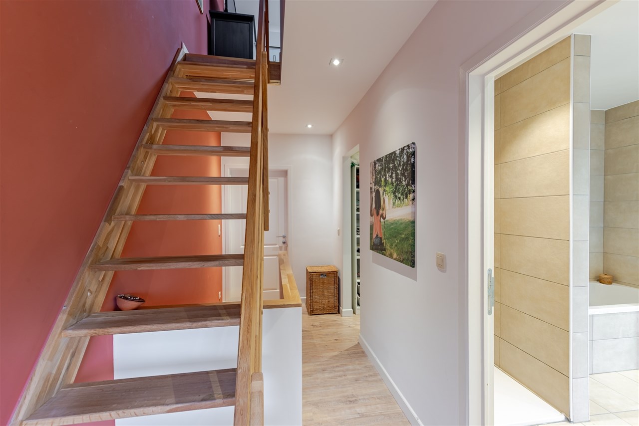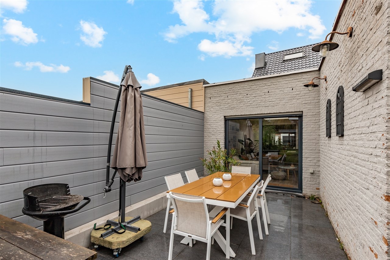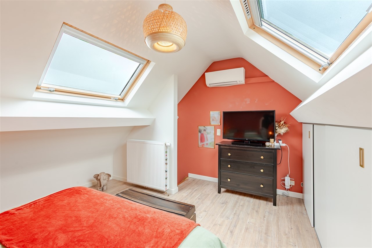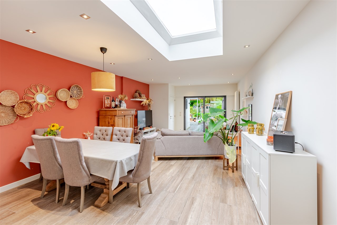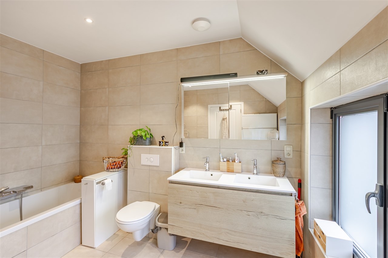 Deze prachtig ingerichte woning werd verbouwd in 2018 en bevindt zich in een kindvriendelijke, doodlopende straat te Erembodegem. Deze is onmiddellijk instapklaar en gelegen op een Zuidoostelijk georiënteerd perceel van 4 are 5 centiare. Via de inkomhal op het gelijkvloers krijgt men toegang tot de speelhoek / bureauruimte en de open, mooi ingerichte keuken (AEG-toestellen) met plaats voor een ontbijttafel. De ruime en lichtrijke woonkamer biedt een rustgevend zicht op de achterliggende tuin met aangelegd terras en groenzicht. Verder bevinden zich nog op het gelijkvloers een apart toilet en een berging / wasplaats met doorgang naar de tuin. Via deze berging is er ook een afgesloten doorgang naar de straatzijde, wat bijzonder praktisch is voor vuilnisbakken, GFT, (brom)fietsen etc. Op de eerste verdieping bevindt er zich een ruime slaapkamer, een aparte dressing en een luxueuze badkamer met inloopdouche, ligbad, hangtoilet en dubbel badkamermeubel. De zolder is ingericht als slaapkamer en is voorzien van ingebouwde kasten. Airco is voorzien op de eerste en tweede verdieping. Dak en plat dak zijn recent (en geïsoleerd), elektriciteit 100% conform en asbestveilig. Centrale verwarming op aardgas (installatie 2018). Parkeermogelijkheid in de straat aanwezig. Absolute topper!