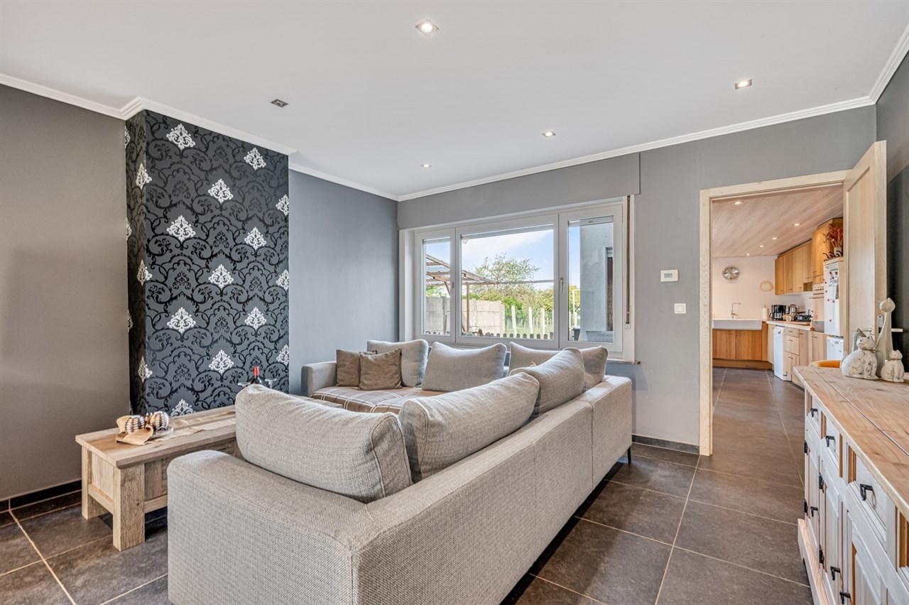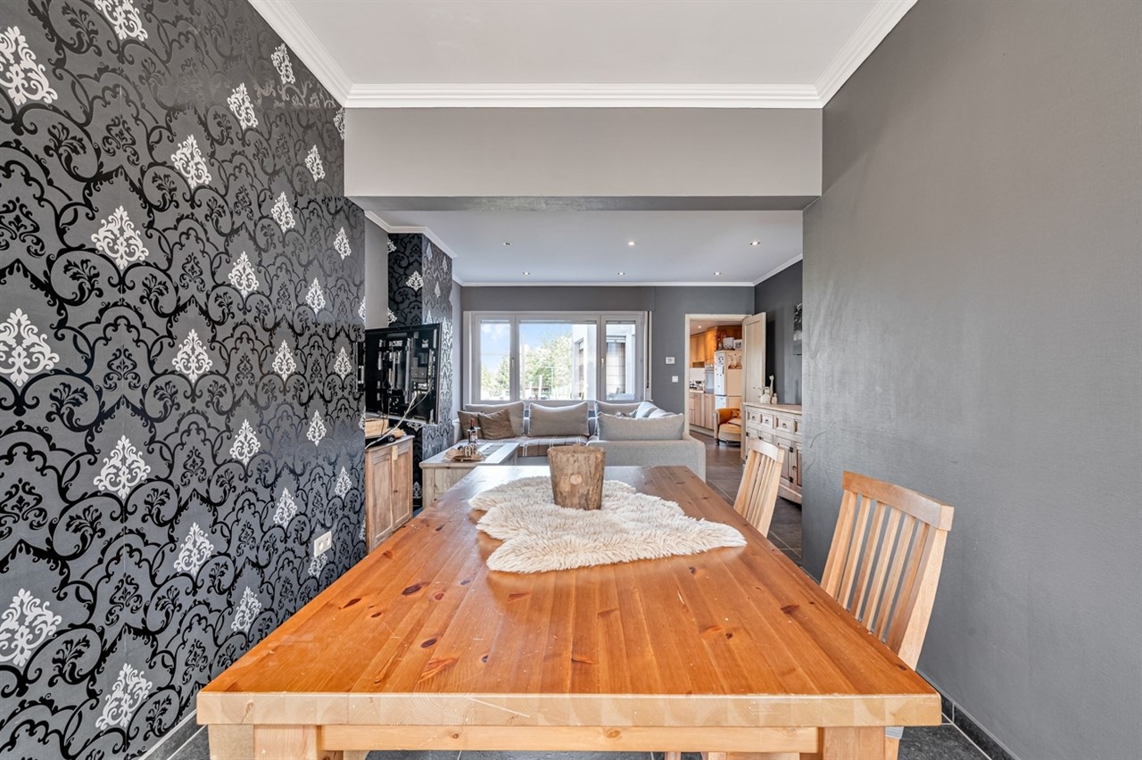 Op het gelijkvloers geeft de inkomhal toegang tot de ruime woonkamer met zithoek. Aansluitend bevindt zich de keuken, uitgerust met kookplaat, oven en vaatwasmachine. Vanuit de keuken bereikt men de grote tuin met koer en buitenberging. Via de koer is er een afgesloten doorgang naar de straatzijde, wat bijzonder praktisch is voor vuilnisbakken, GFT, fietsen of bromfietsen.