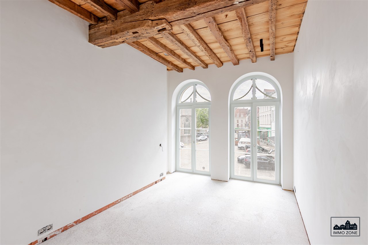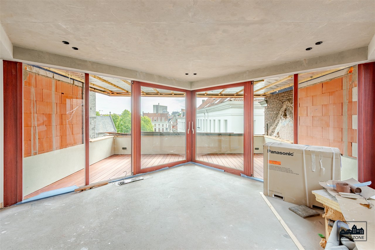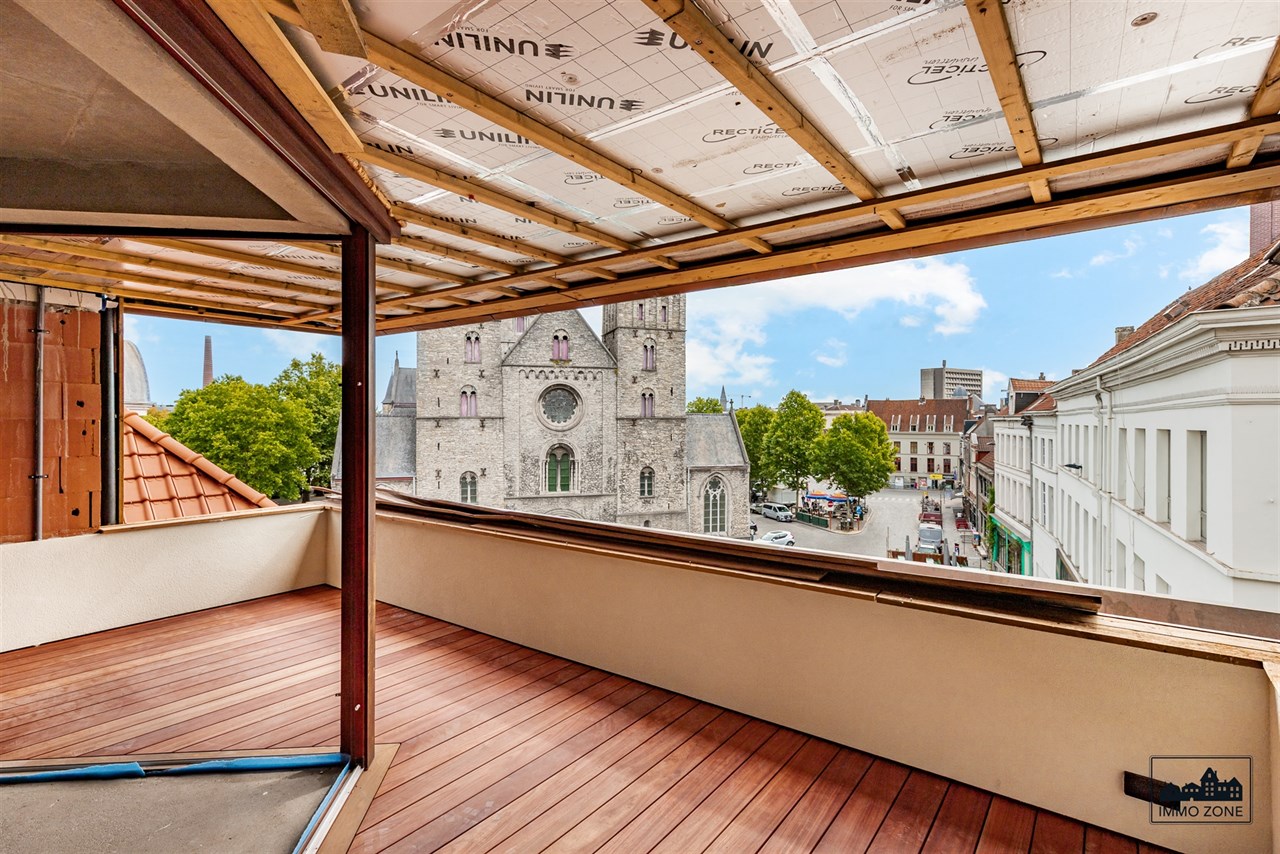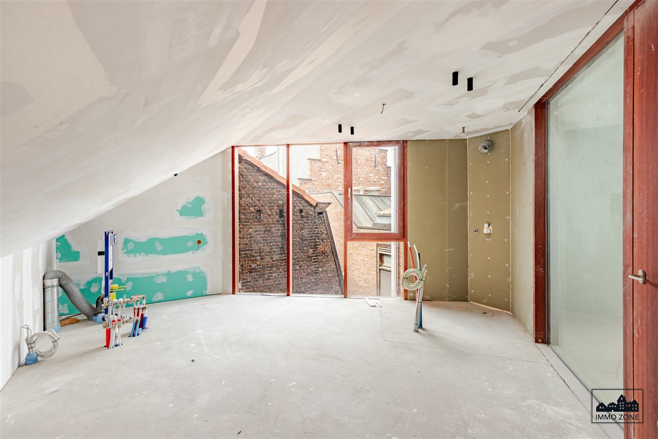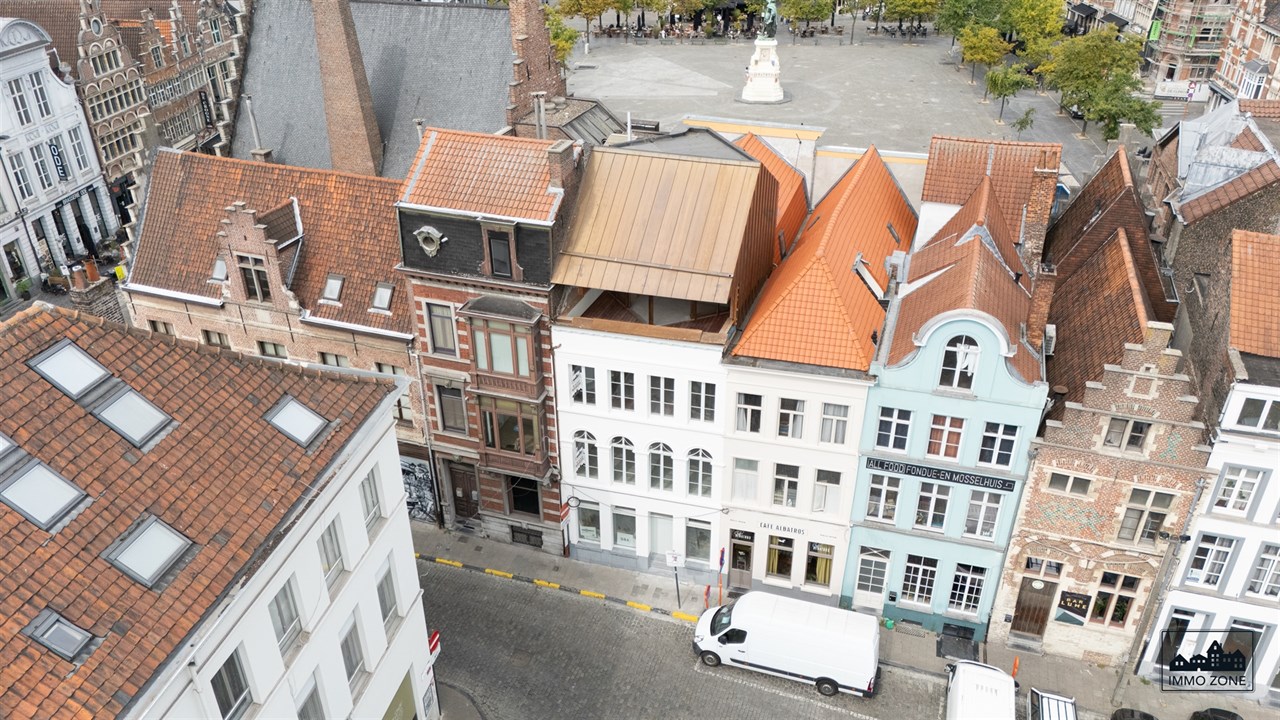 Op de eerste verdieping zorgen twee ruime slaapkamers en een stijlvolle badkamer voor rust en privacy, net boven het straatniveau. Een verdieping hoger vormt de open keuken met eetruimte en wintertuin het hart van de woning: een serene, groene plek midden in de stad. Het nieuwe mansardedak in antraciet zink voegt twee lichtrijke woonlagen toe, met een panoramische leefruimte aan de voorzijde en een intiem terras achteraan, uitkijkend op de Vrijdagsmarkt. De bovenste verdieping biedt een extra slaapkamer met eigen badkamer. Grote schuiframen, geperforeerde panelen en subtiele materialiteit zorgen voor een vloeiende overgang tussen binnen en buiten.