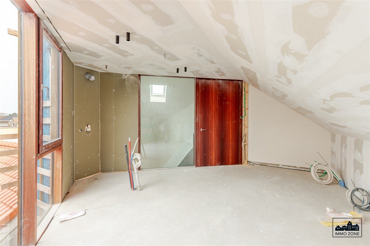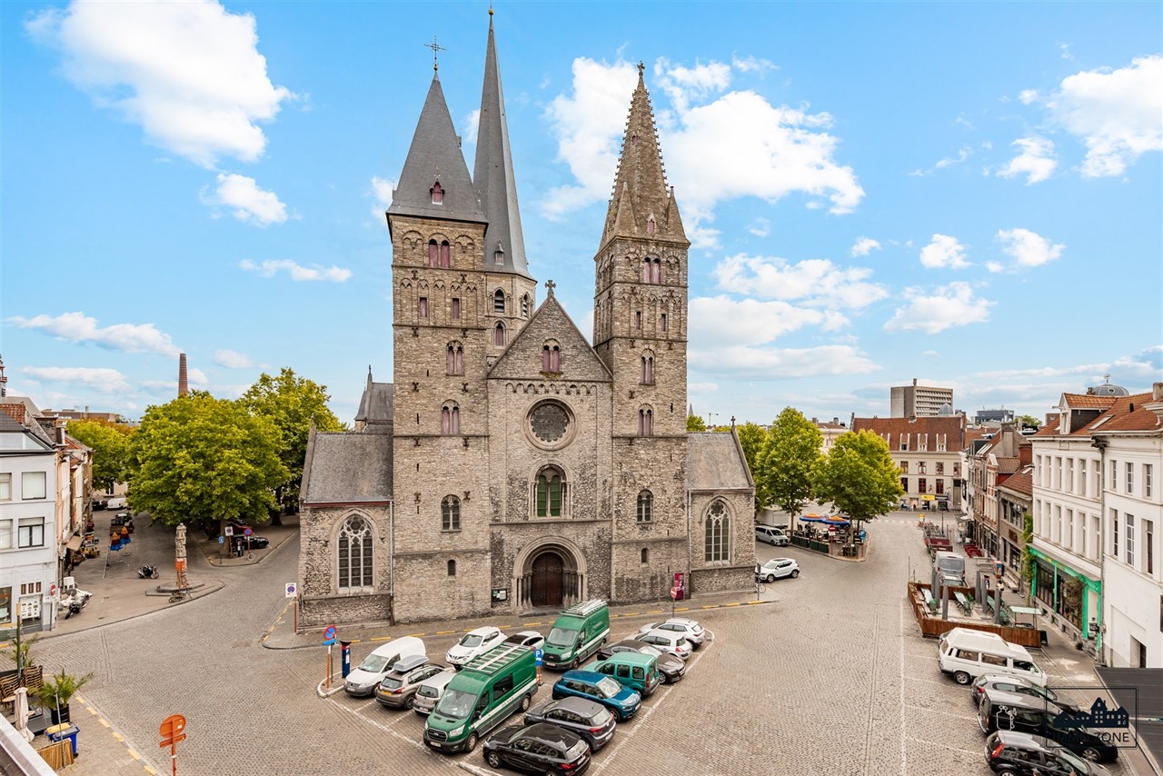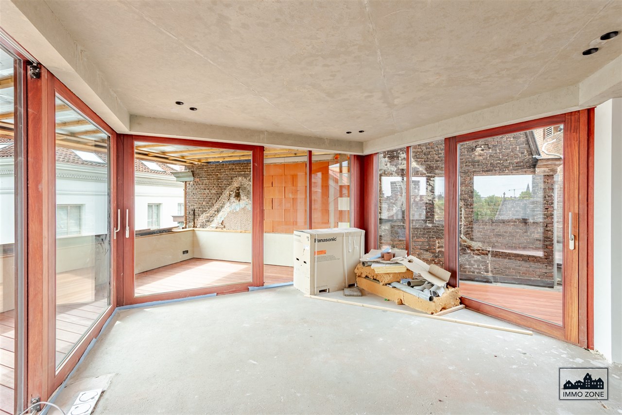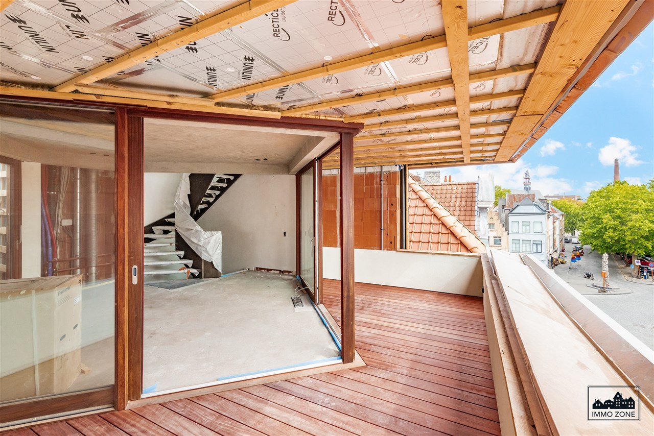 Op de eerste verdieping zorgen twee ruime slaapkamers en een stijlvolle badkamer voor rust en privacy, net boven het straatniveau. Een verdieping hoger vormt de open keuken met eetruimte en wintertuin het hart van de woning: een serene, groene plek midden in de stad. Het nieuwe mansardedak in antraciet zink voegt twee lichtrijke woonlagen toe, met een panoramische leefruimte aan de voorzijde en een intiem terras achteraan, uitkijkend op de Vrijdagsmarkt. De bovenste verdieping biedt een extra slaapkamer met eigen badkamer. Grote schuiframen, geperforeerde panelen en subtiele materialiteit zorgen voor een vloeiende overgang tussen binnen en buiten.