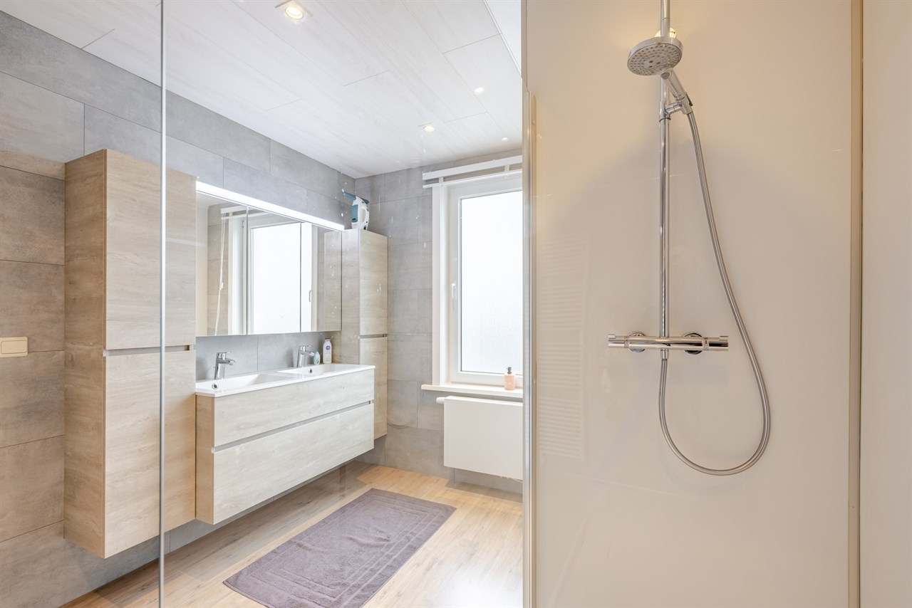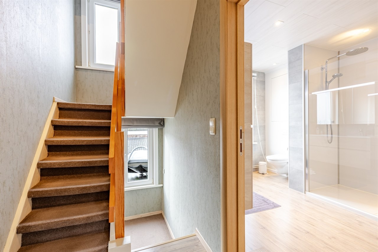 Op de eerste verdieping bevinden zich een grote slaapkamer en de vernieuwde badkamer met inloopdouche.