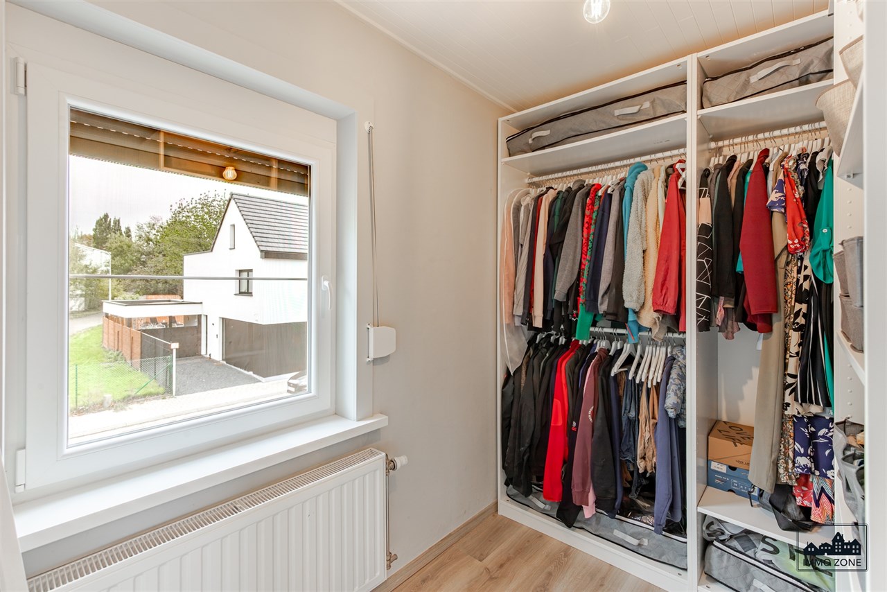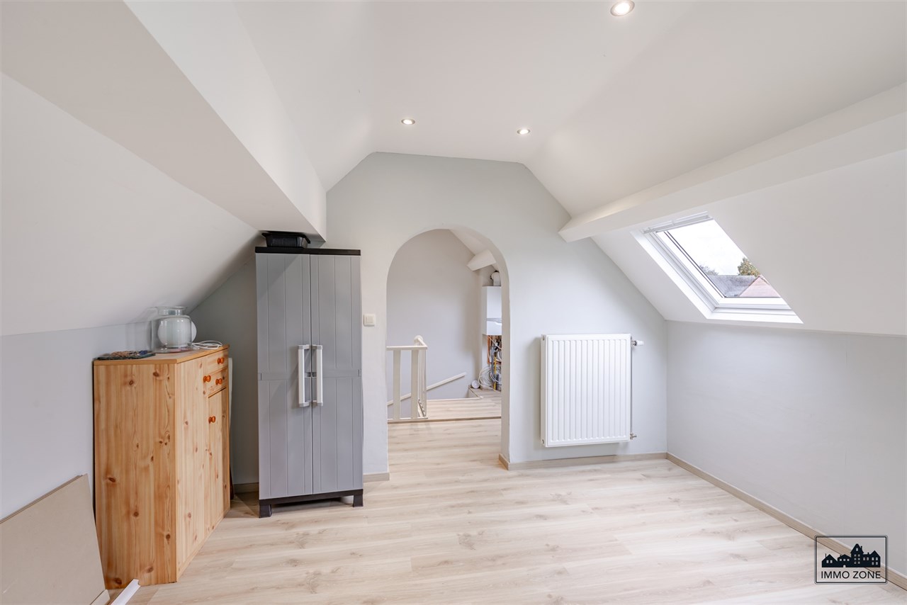 Op de eerste verdieping vindt u een ruime badkamer met inloopdouche, twee ruime, volwaardige slaapkamers en een derde kamer die momenteel is ingericht als dressing. De zolderverdieping, bereikbaar via een vaste trap, werd afgewerkt tot een vierde kamer en beschikt over bijkomende bergruimte.
