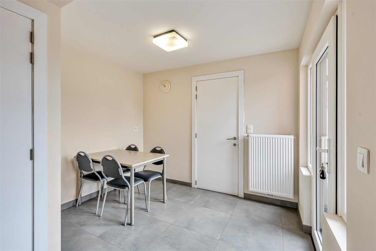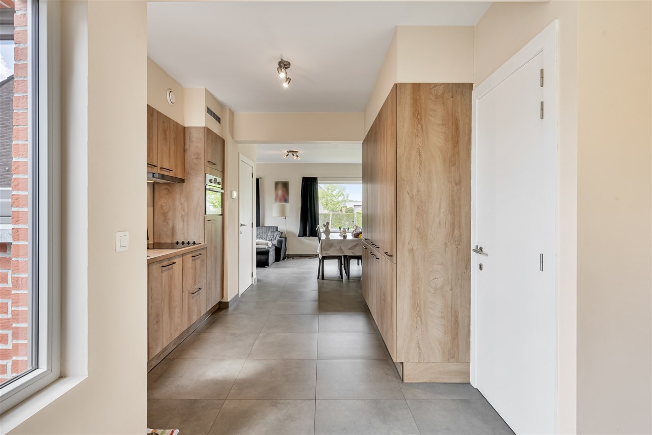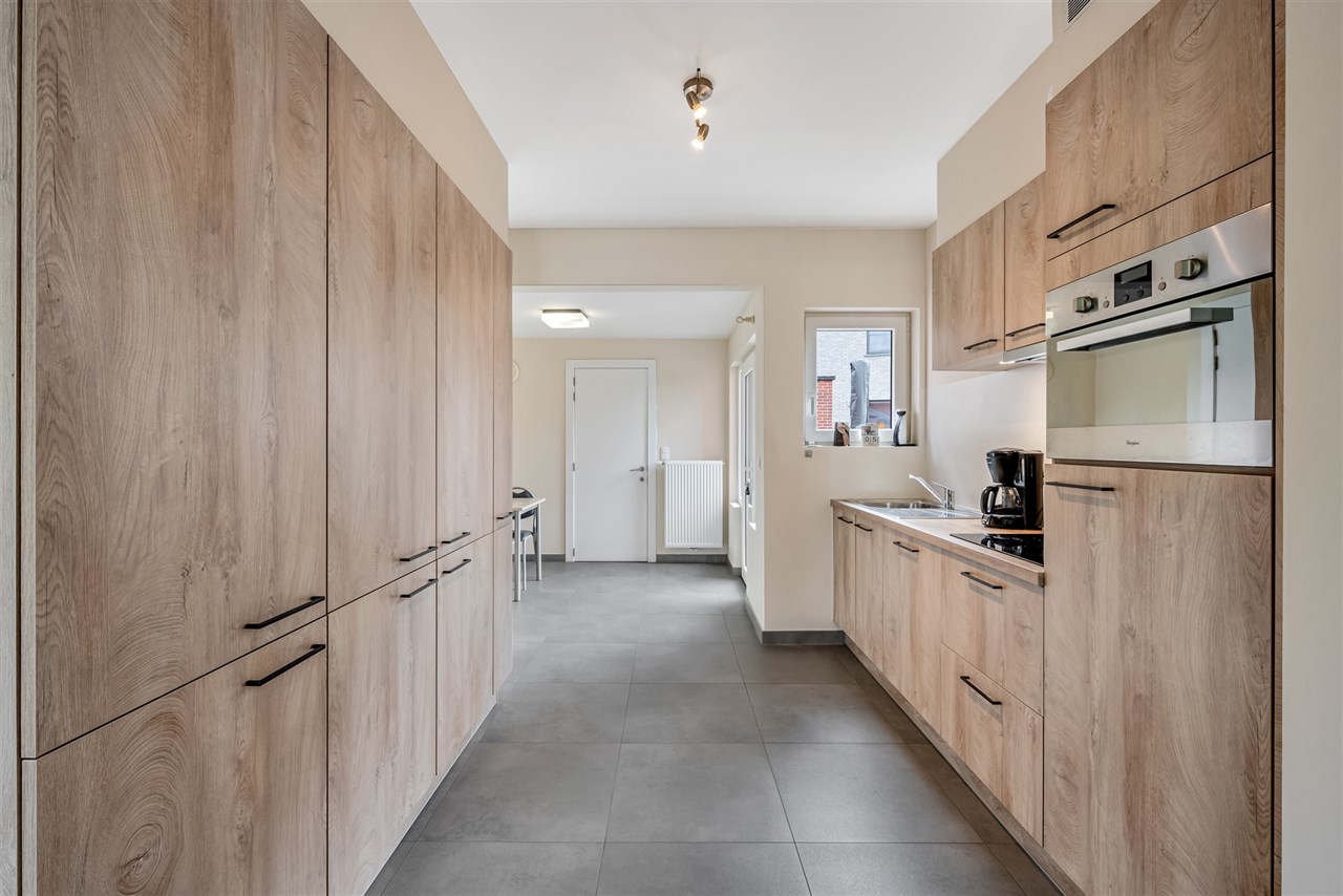 Op het gelijkvloers bevinden zich de inkomhal, de ingerichte keuken met eethoek, lichtrijke woonkamer, een berging of washok, en de ingerichte badkamer.