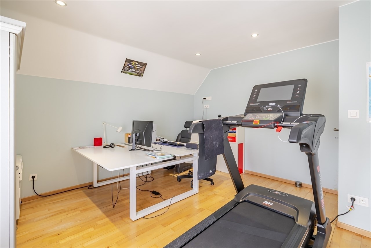 Op het gelijkvloers is er een ruime inkomhal, toilet, ontzettend ruime en lichtrijke woonkamer met open keuken, een grote bergruimte en een bureau of praktijkruimte.