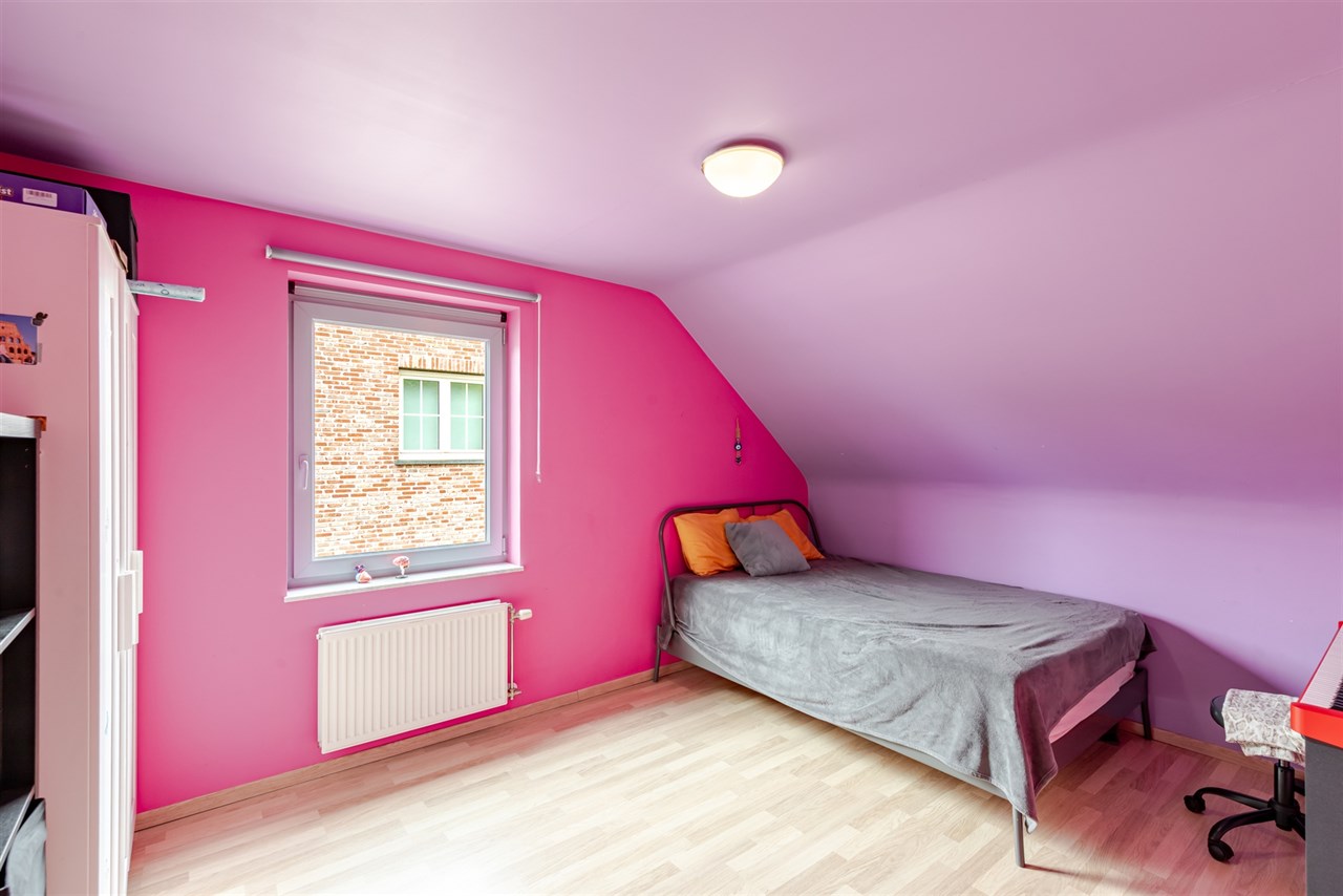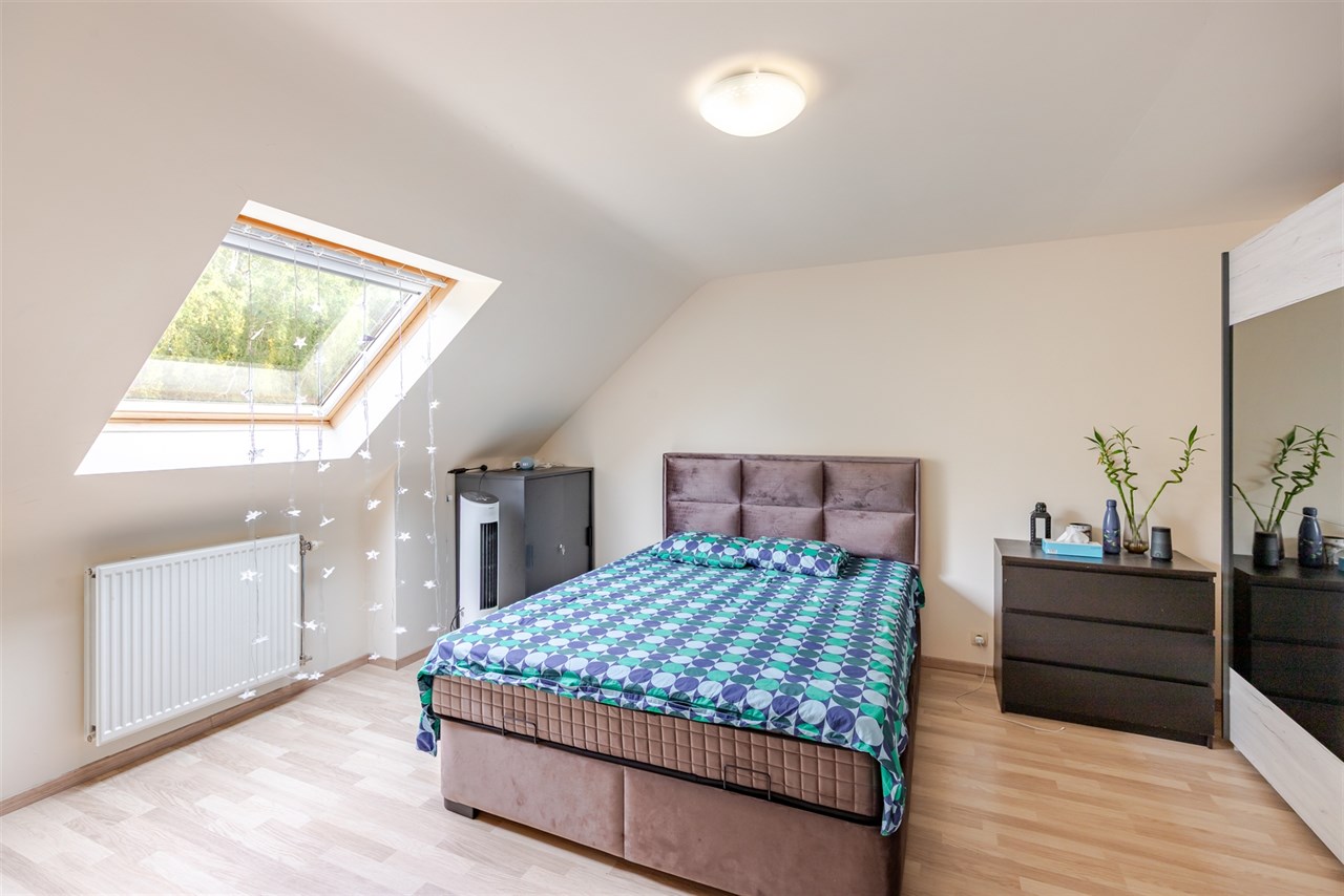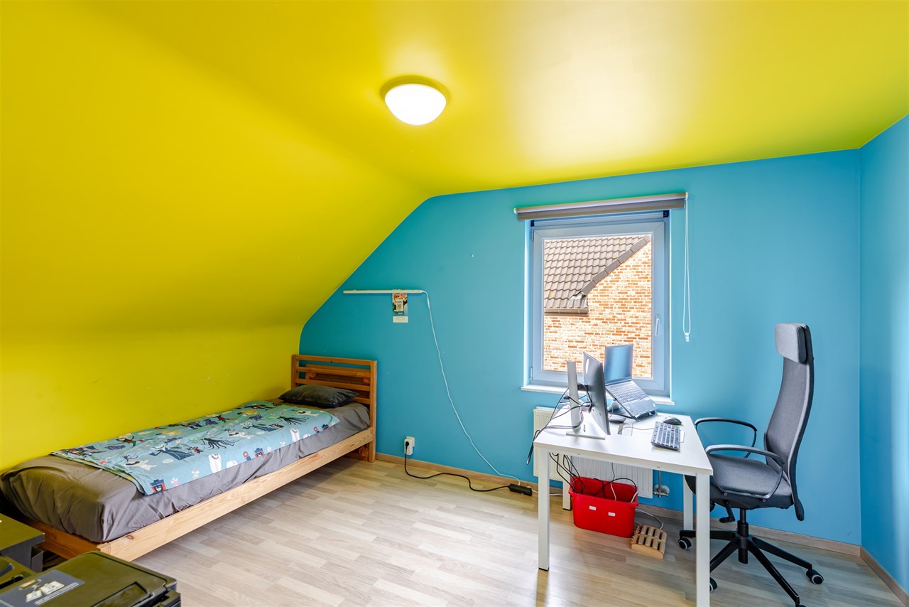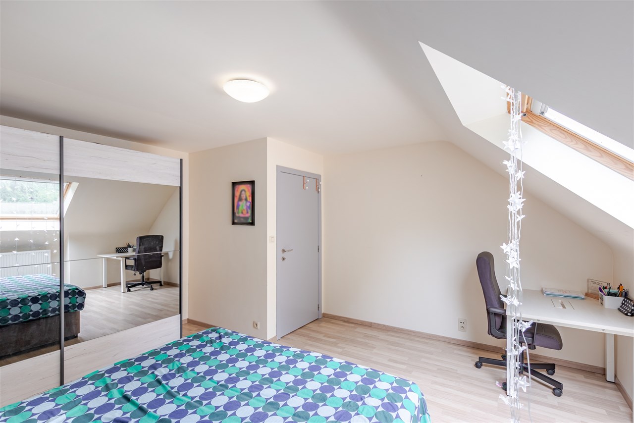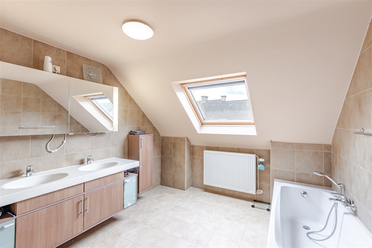Op de eerste verdieping zijn er drie ruime slaapkamers die perfect zijn voor een gezin met twee kinderen en het toekomstperspectief om verder mee te groeien. De badkamer is volledig uitgerust met inloopdouche, ligbad, toilet en dubbele wastafel. Daarboven bevindt zich nog een zolderruimte die kan dienen als bijkomende bergruimte.