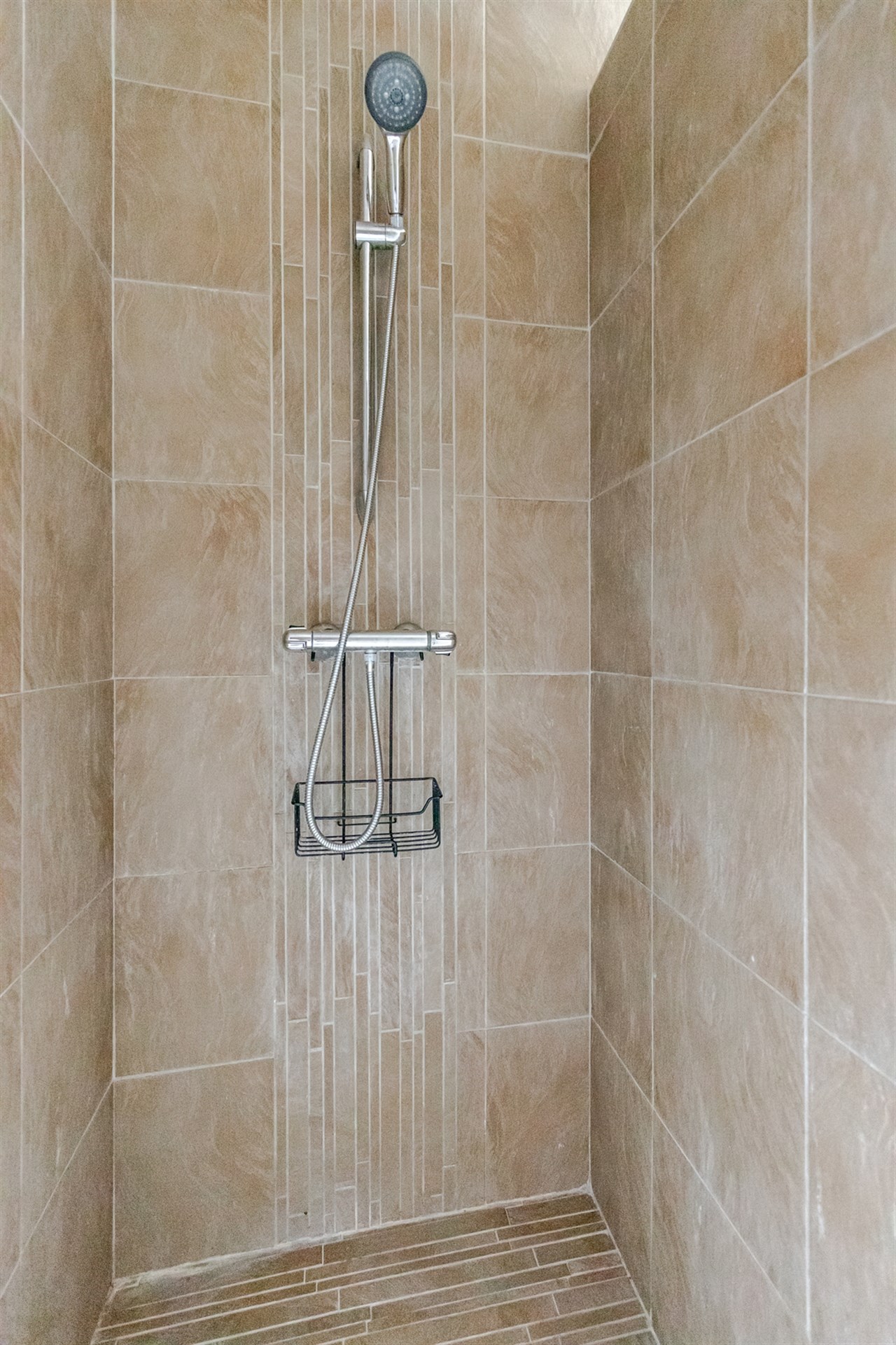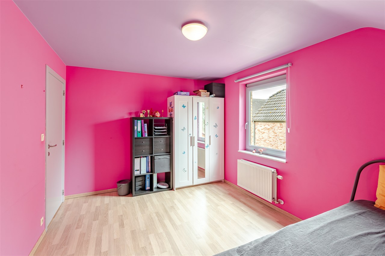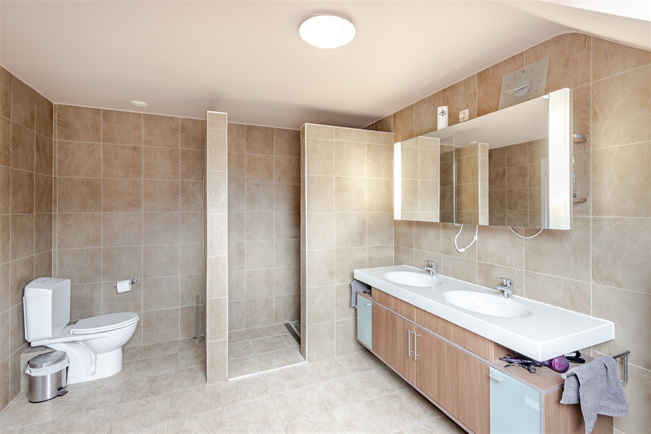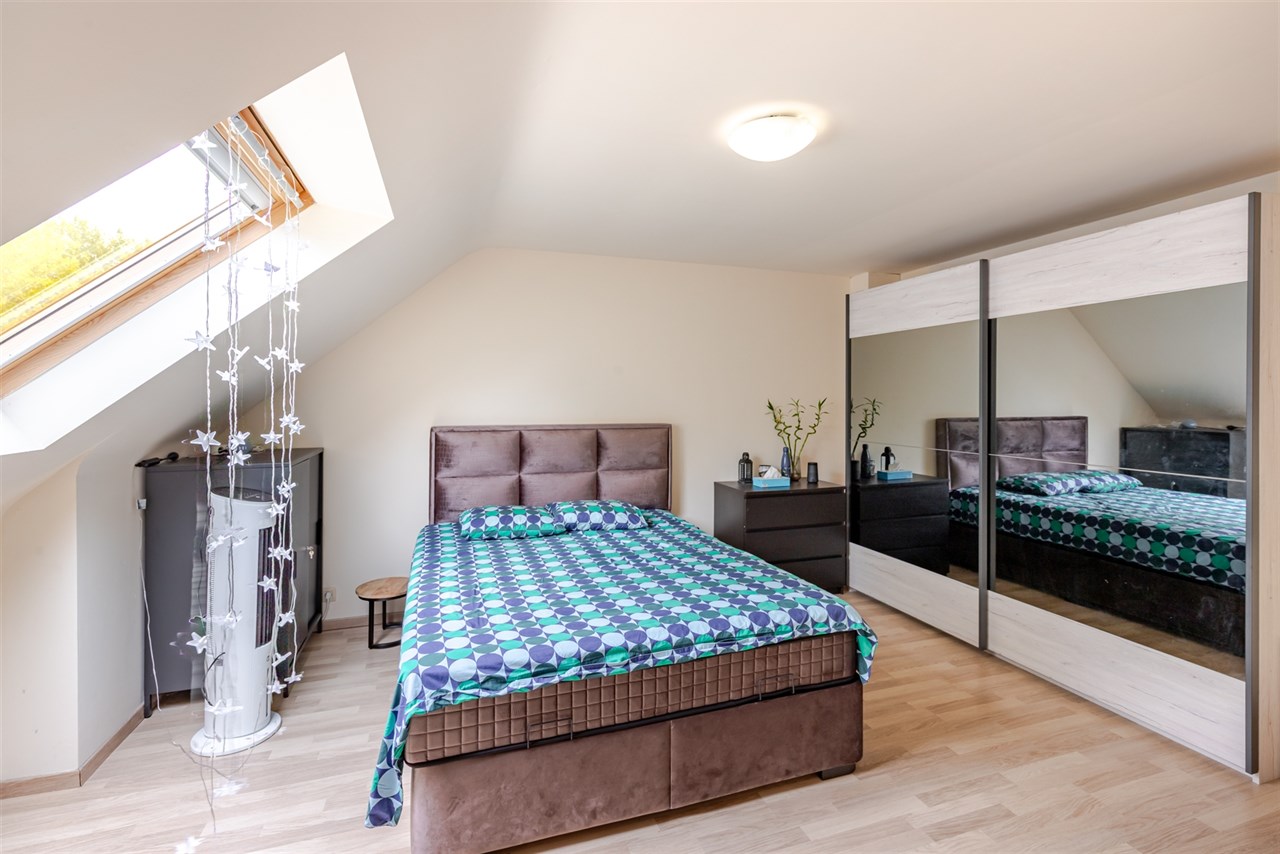 Op de eerste verdieping zijn er drie ruime slaapkamers die perfect zijn voor een gezin met twee kinderen en het toekomstperspectief om verder mee te groeien. De badkamer is volledig uitgerust met inloopdouche, ligbad, toilet en dubbele wastafel. Daarboven bevindt zich nog een zolderruimte die kan dienen als bijkomende bergruimte.