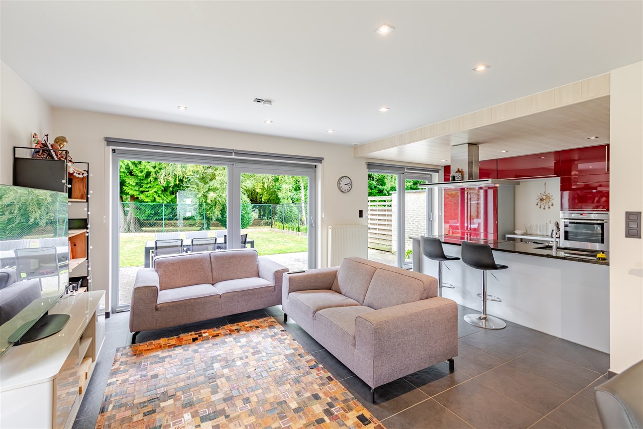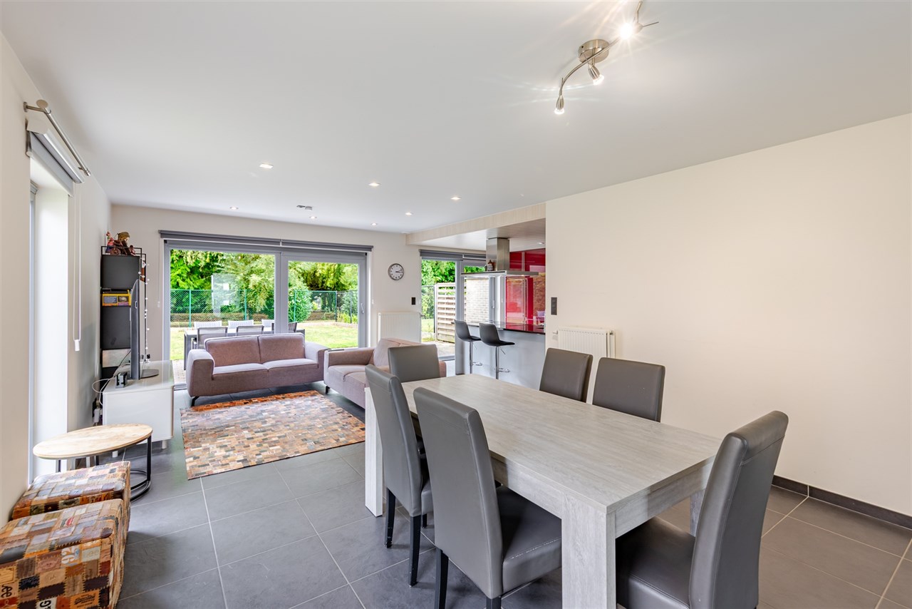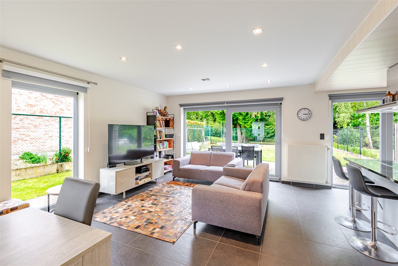 Bij het binnenkomen verwelkomt de inkomhal met apart toilet je meteen. De lichtrijke woonkamer met open keuken vormt het hart van de woning en geeft uit op een groot terras en een aangename tuin. De inpandige garage zorgt voor extra praktisch comfort. Achter de woning strekt zich een tuin met vijver uit, waardoor je geniet van een prachtig groenzicht en een oase van rust.