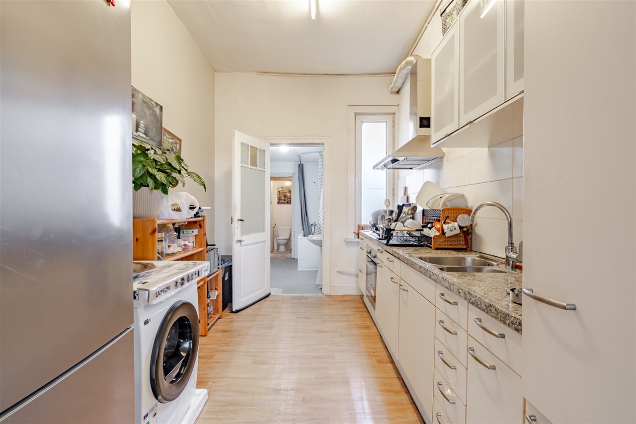 Het gebouw is fysiek verdeeld in 2 aparte woonentiteiten; 2 woonkamers, 2 keukens, 2 badkamer en in totaal 3 slaapkamers.
