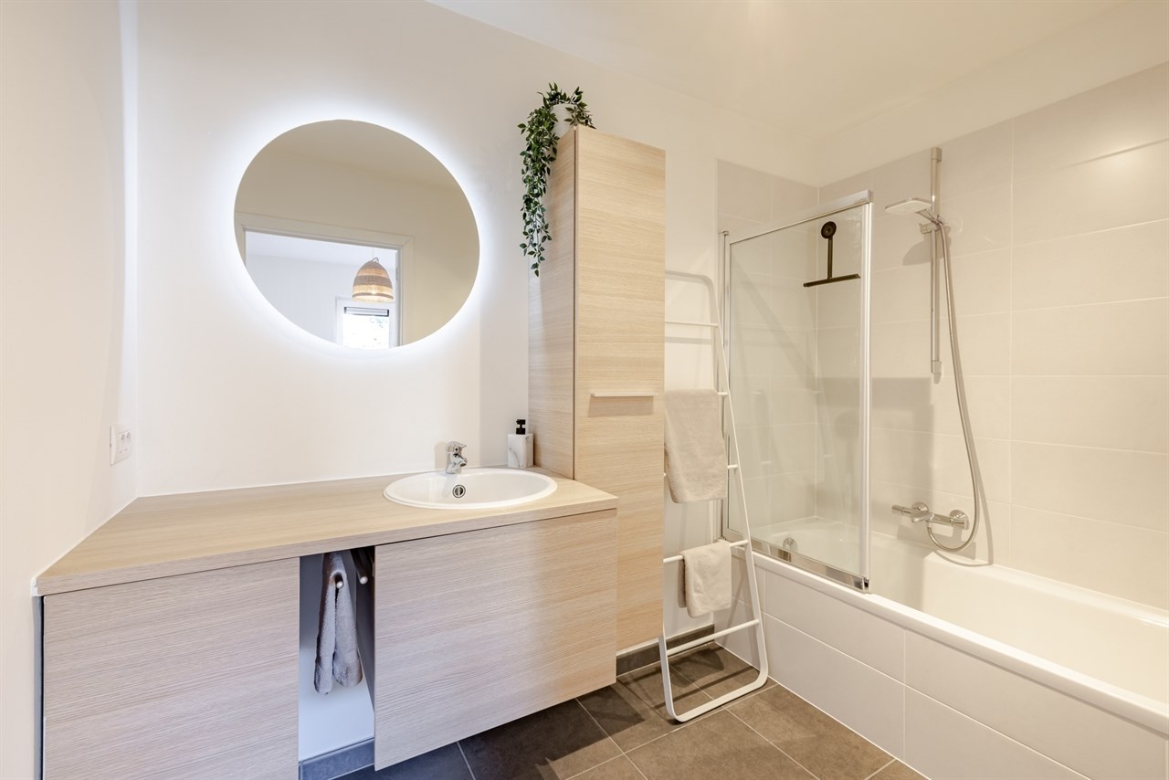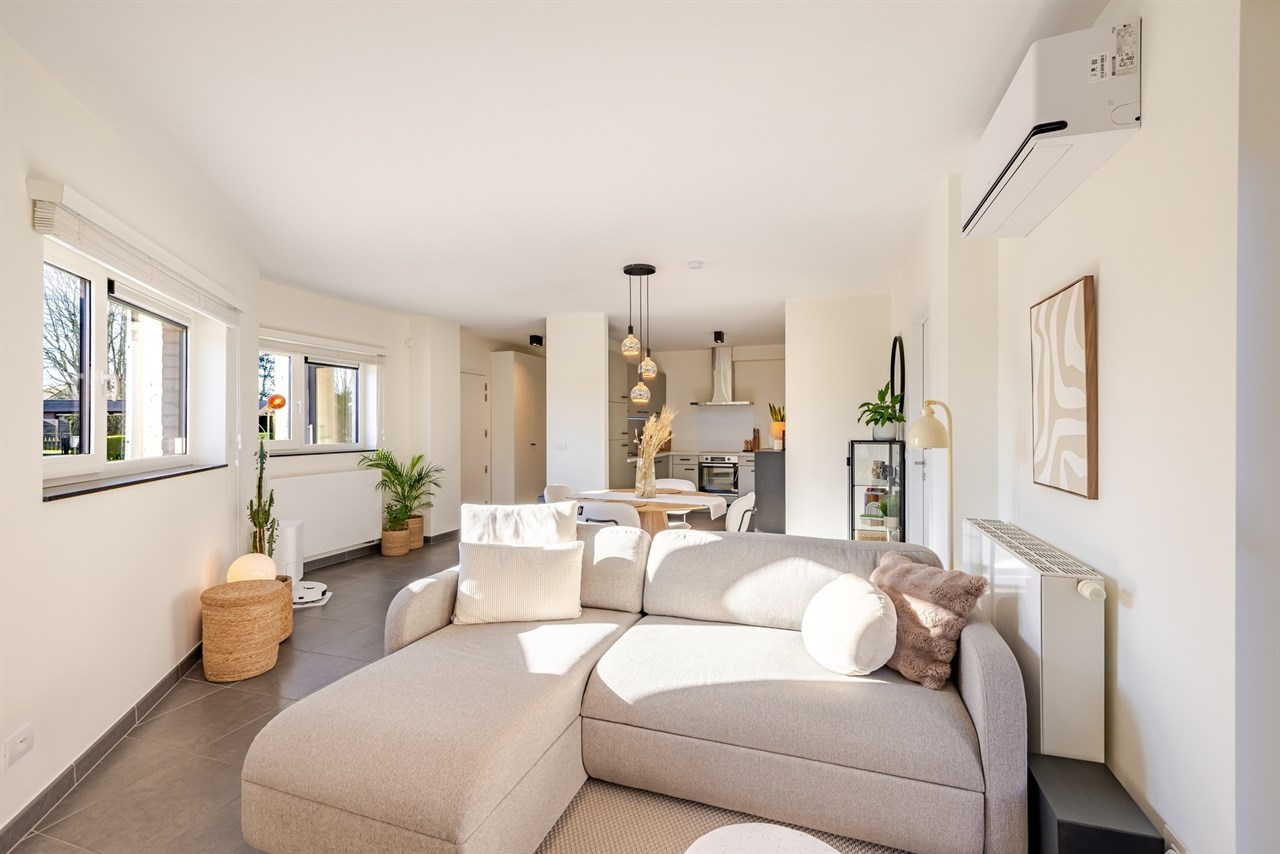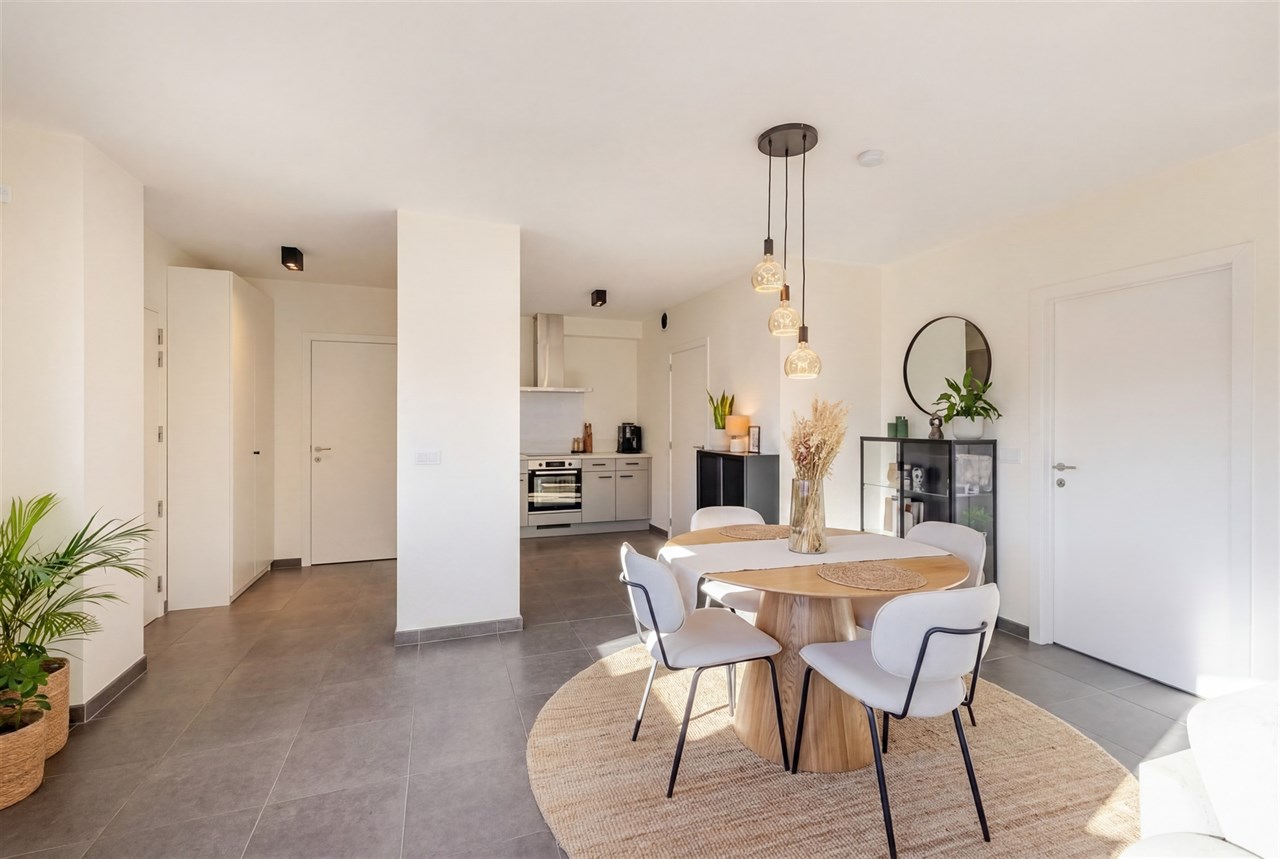 De indeling is als volgt: inkomhal met vestiaire en gastentoilet, gezellige leefruimte met open keuken die voorzien is van alle comfort zoals een inductie kookplaat, ingebouwde frigo, oven en vaatwasser. Aansluitend aan de keuken is een praktische berging/ wasplaats. Verder vinden we een mooie slaapkamer met een moderne en suite badkamer die voorzien is van een douche in bad.