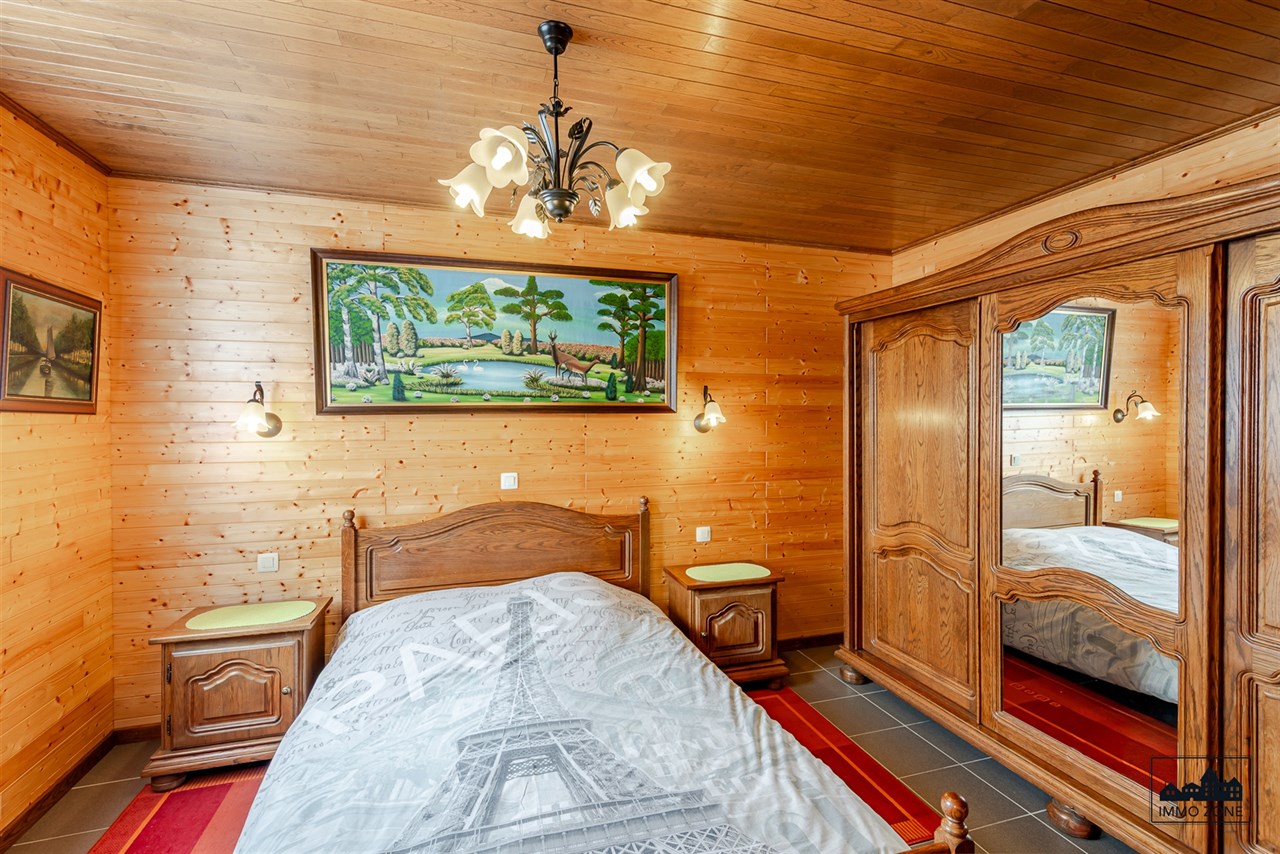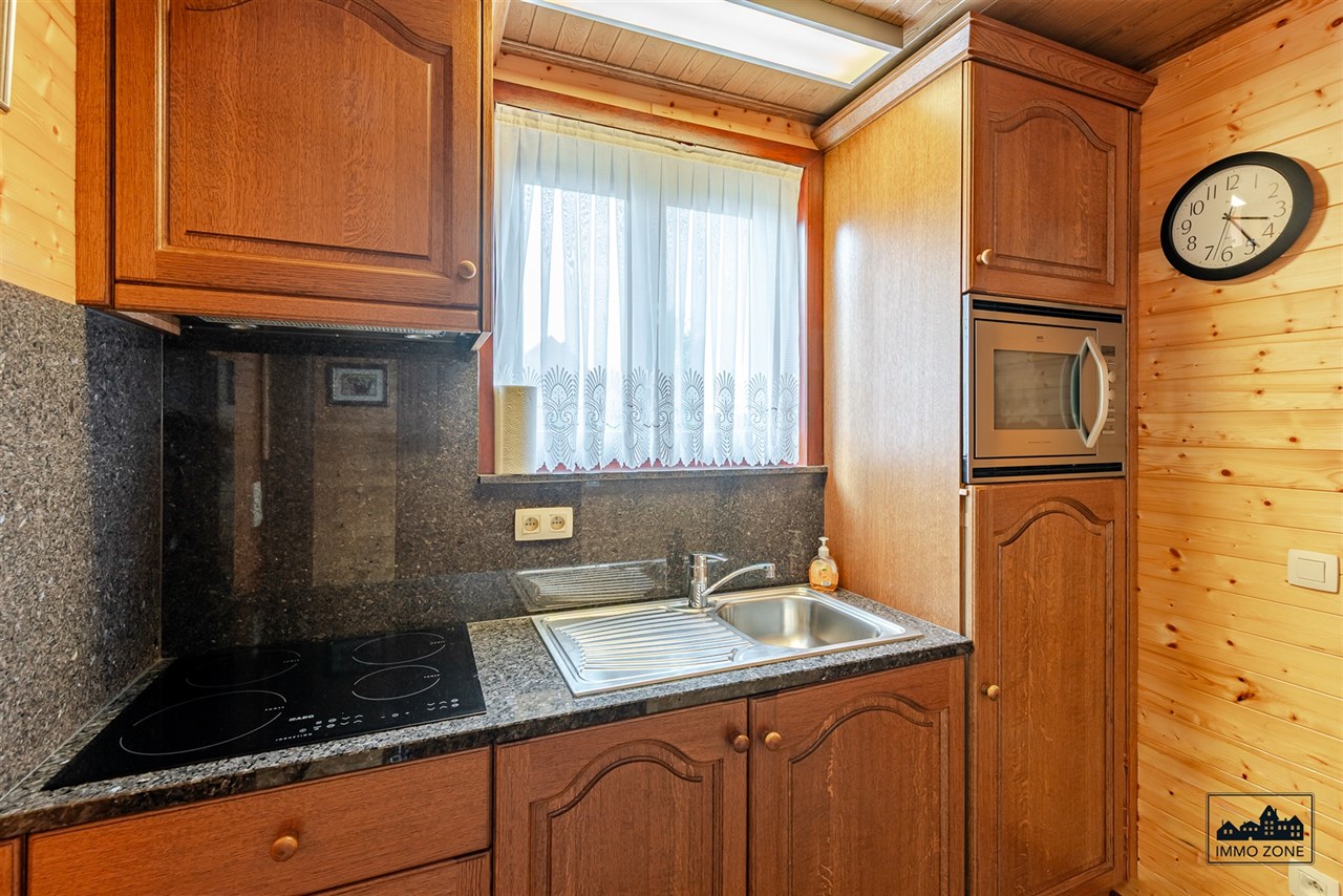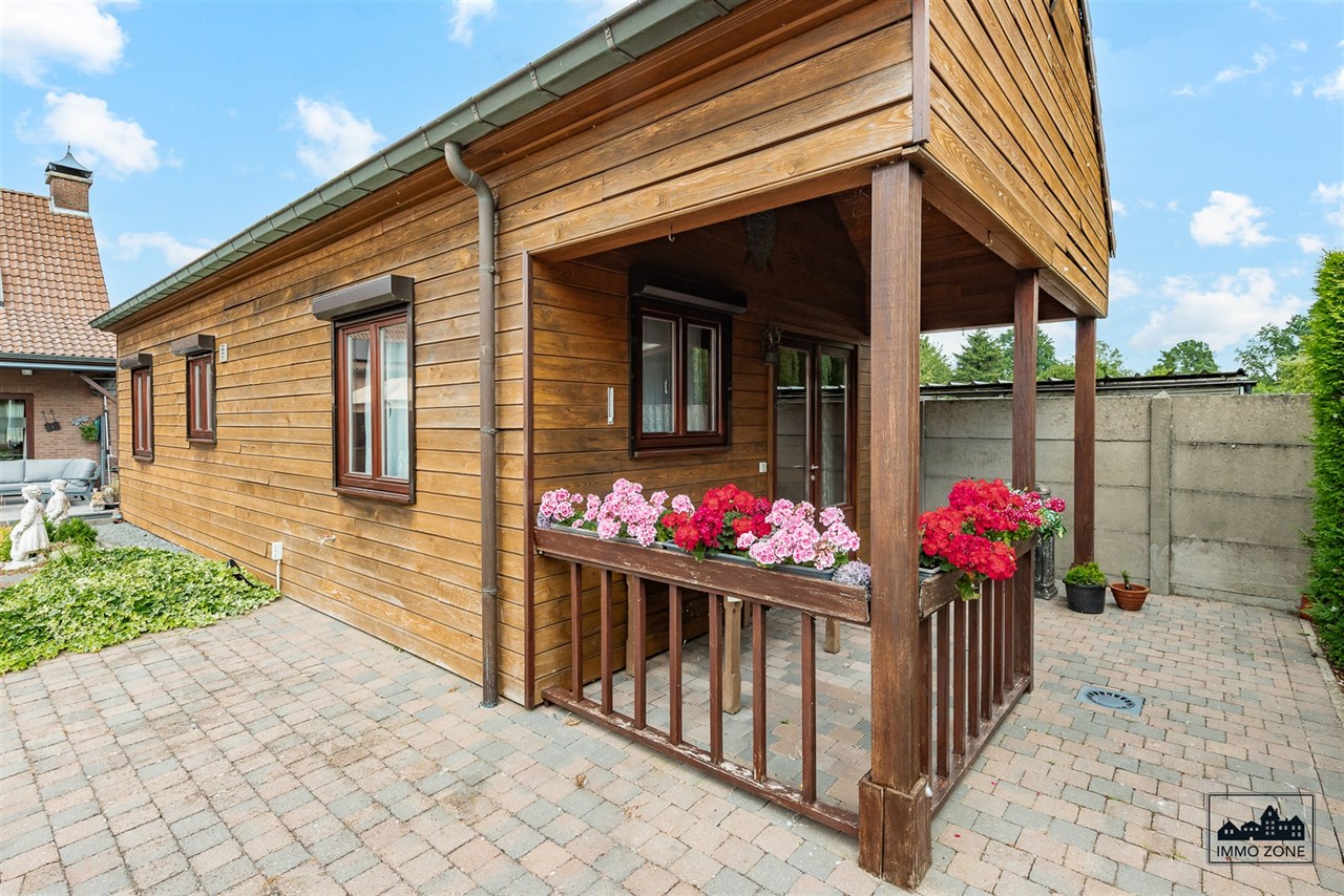 Achter de woning vindt u een instapklare chalet die kan dienen als aparte woonst. U vindt hier een leefruimte, keuken, badkamer en slaapkamer met voldoende bergruimte.