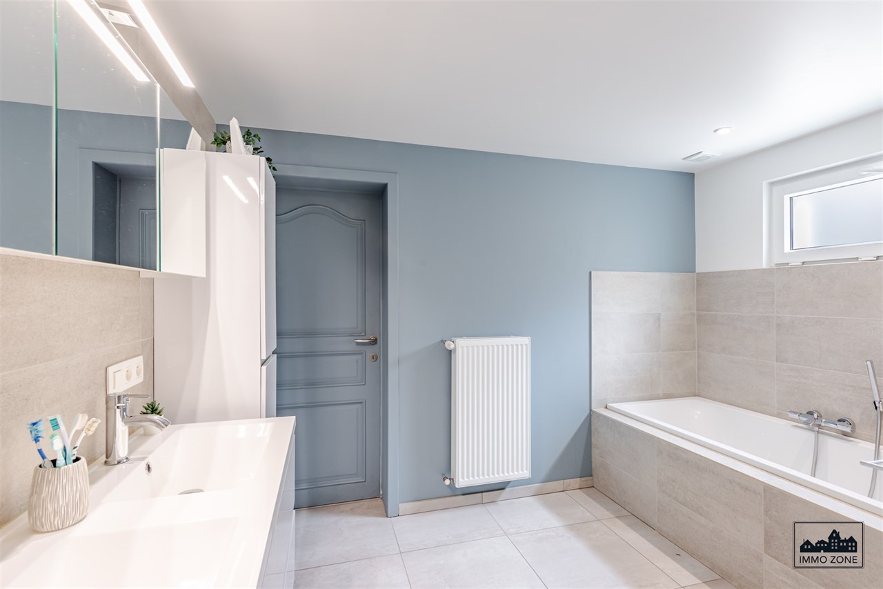 Aan de keuken kan u de ruime berging vinden alsook de eerst badkamer. De badkamer bestaat uit een dubbele lavabo en een douchebad. Verderop kan u het apart gastentoilet terugvinden. Via de berging kan u rechtstreeks het ruime magazijn betreden. Voor het magazijn kan u de binnenkoer vinden met een ruime oprit.