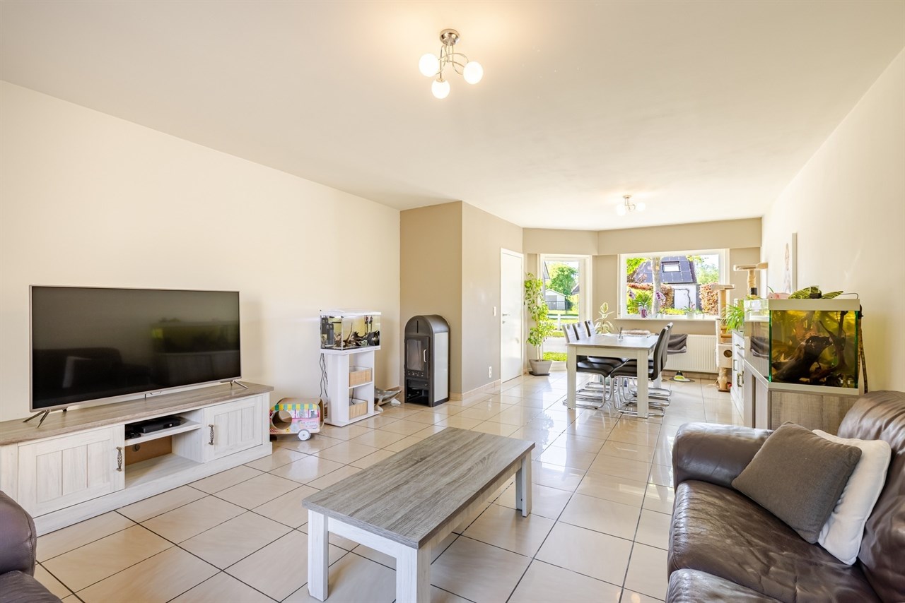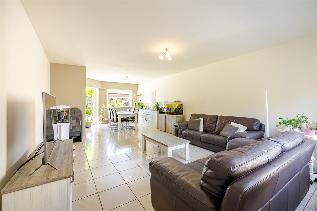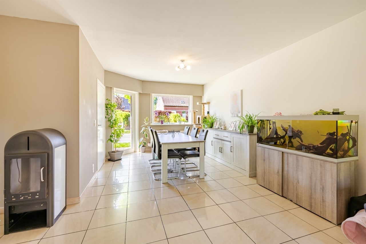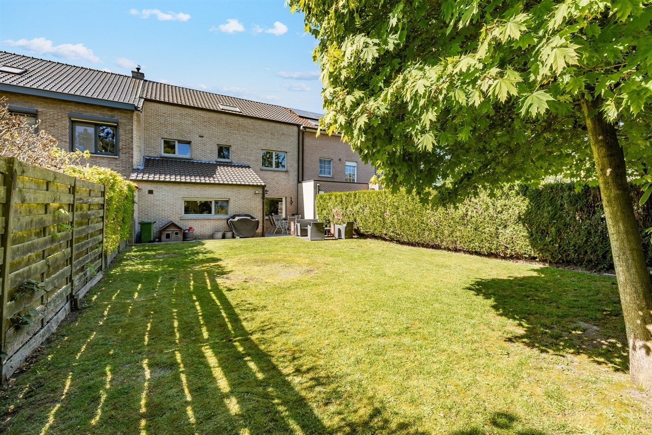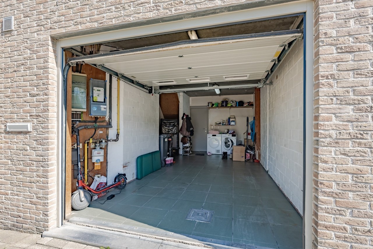 Op het gelijkvloers bevinden zich de inkomhal, de woonkamer met zicht op de tuin, de grote, ingerichte keuken, aansluitend een berging, een apart toilet, en garage.