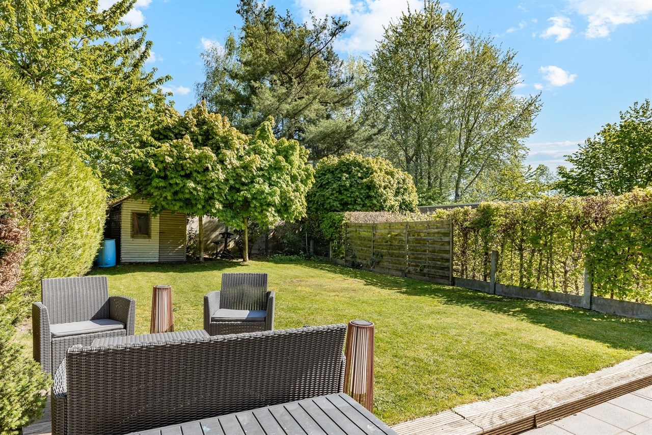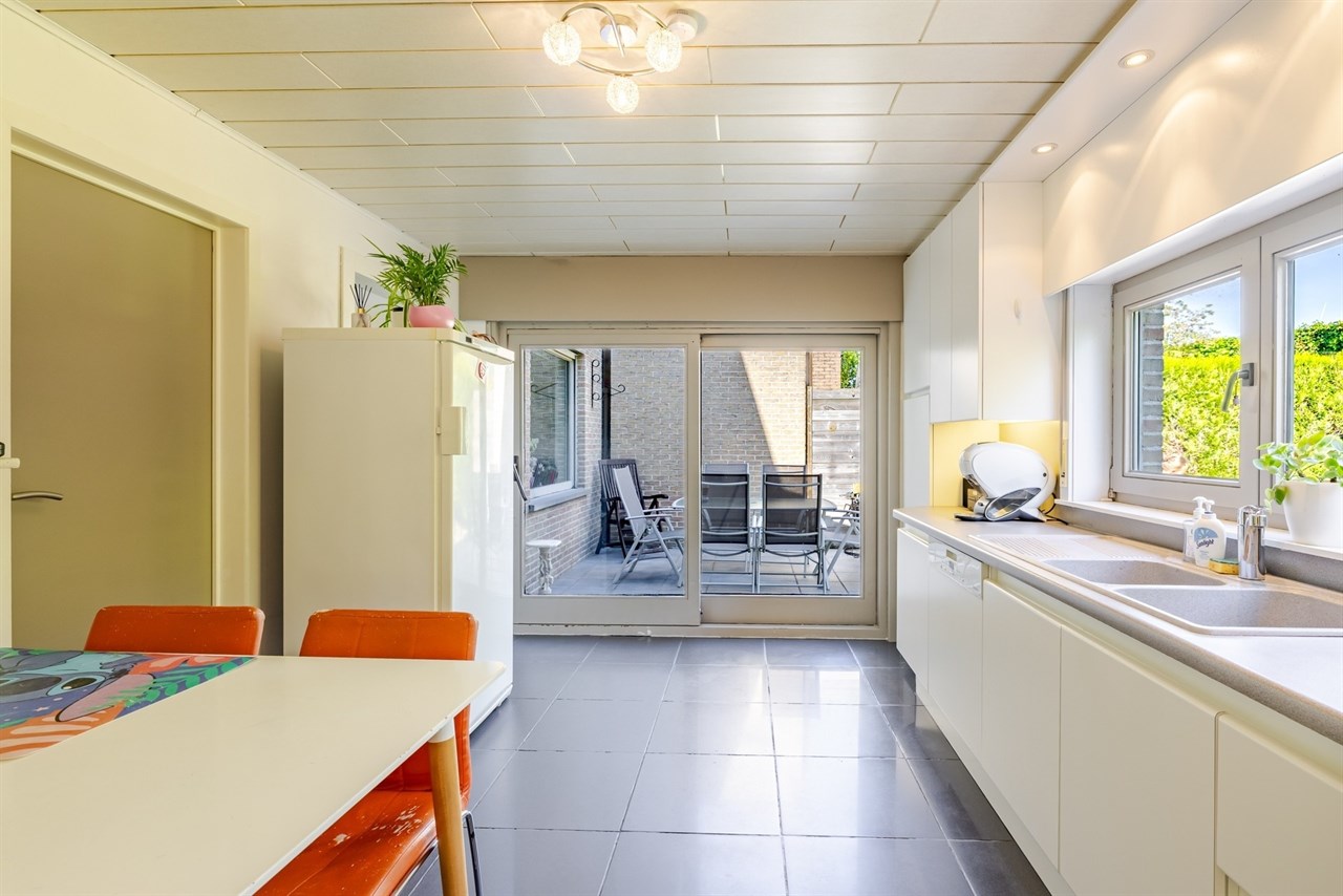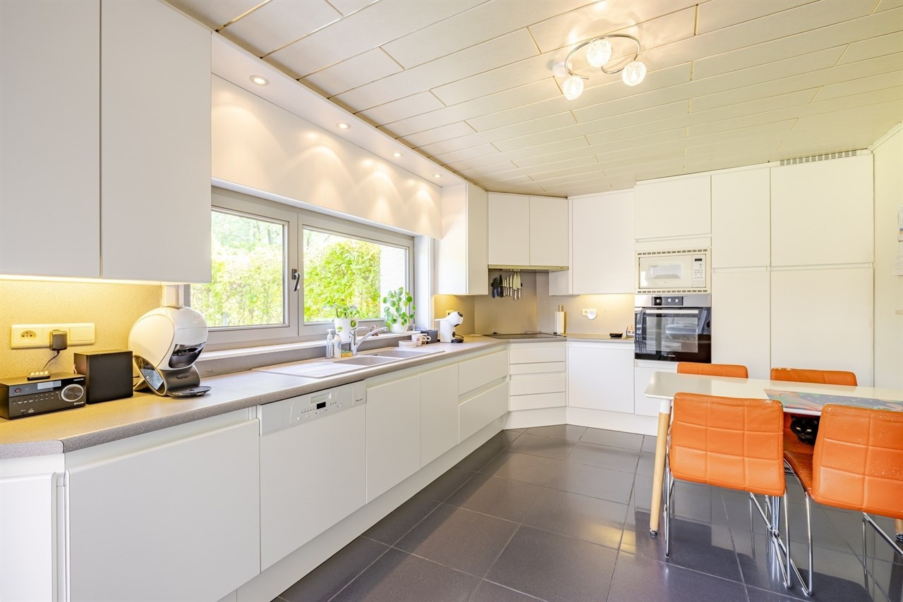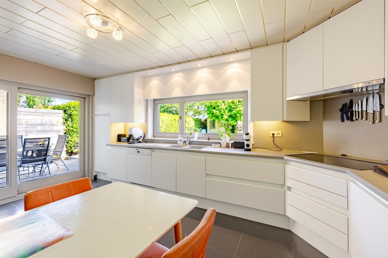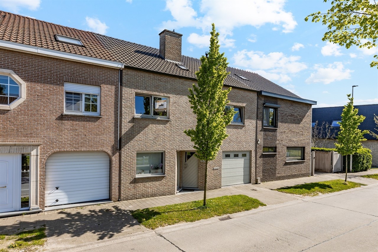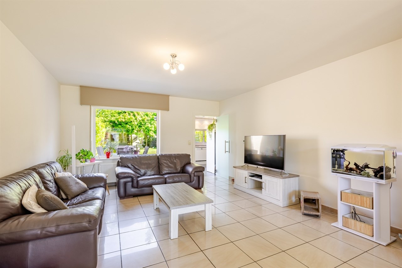 Op het gelijkvloers bevinden zich de inkomhal, de woonkamer met zicht op de tuin, de grote, ingerichte keuken, aansluitend een berging, een apart toilet, en garage.