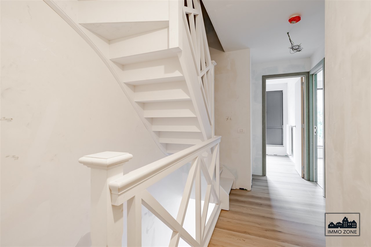 Op de eerste verdieping bevinden zich twee ruime slaapkamers, een bureauruimte, een extra toilet met wasplaats en een stijlvolle badkamer met ligbad en lavabomeubel. Via een vaste trap bereik je de zolderkamer, voorzien van sanitaire aansluitingen en eenvoudig af te werken tot een royale master bedroom met ensuite badkamer. De woning beschikt bovendien over een ondergrondse autostaanplaats, inbegrepen in de prijs.