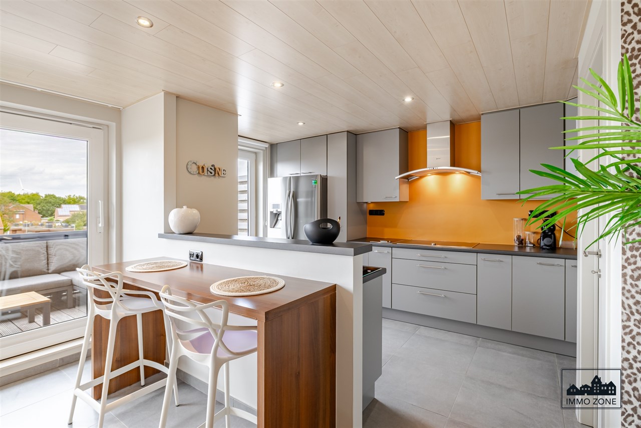 U wordt verwelkomd in de ruime inkomhal met plaats voor een vestiaire en een apart toilet. Via hier wordt u begeleid naar een sfeervolle en royale leefruimte. De leefruimte verbind de bureauruimte en de keuken. De keuken is volledig voorzien van allerhande installaties zoals een ingebouwde Amerikaanse koelkast met diepvriezer.