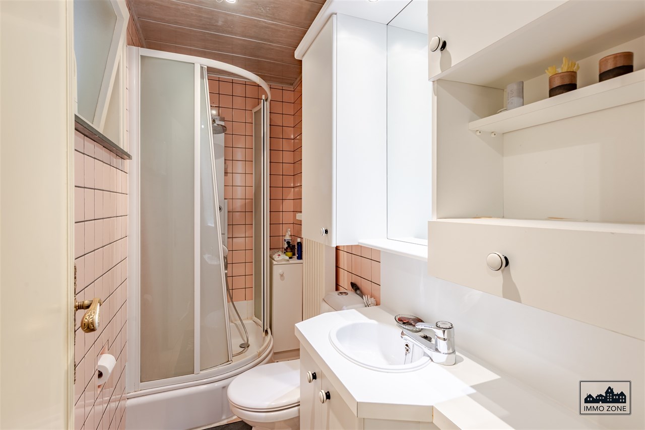 De badkamer bevindt zich eveneens op het gelijkvloers en is voorzien van een douche, toilet en een wastafel.
