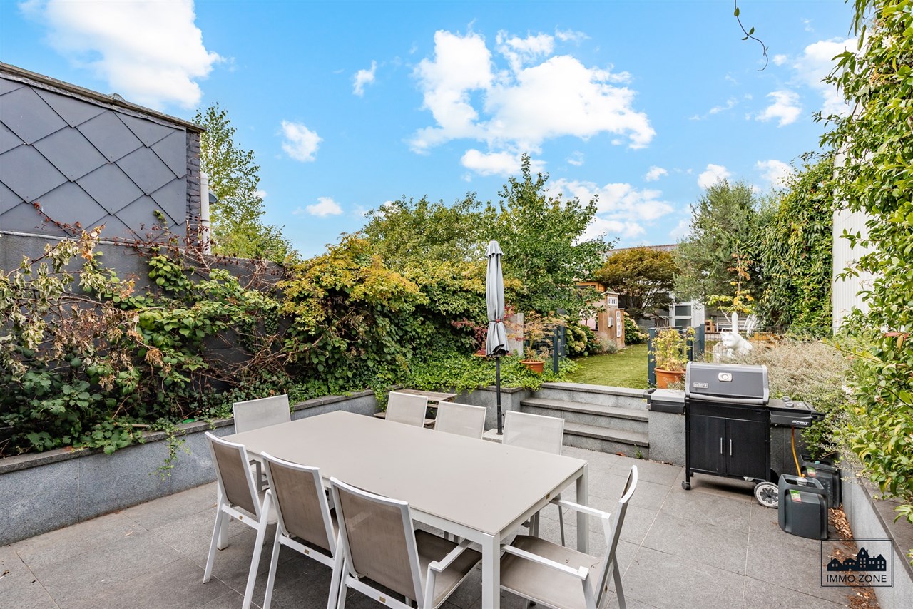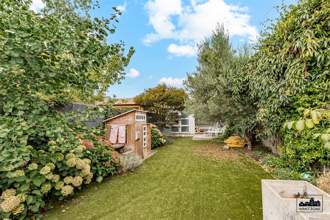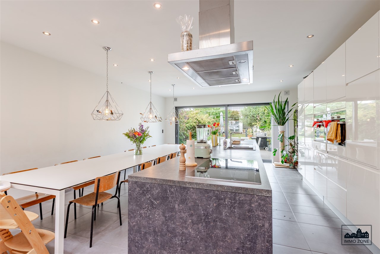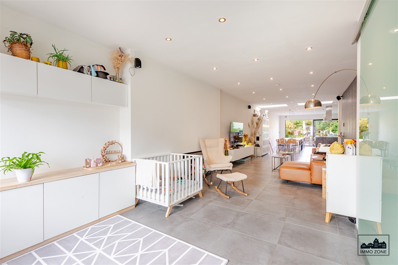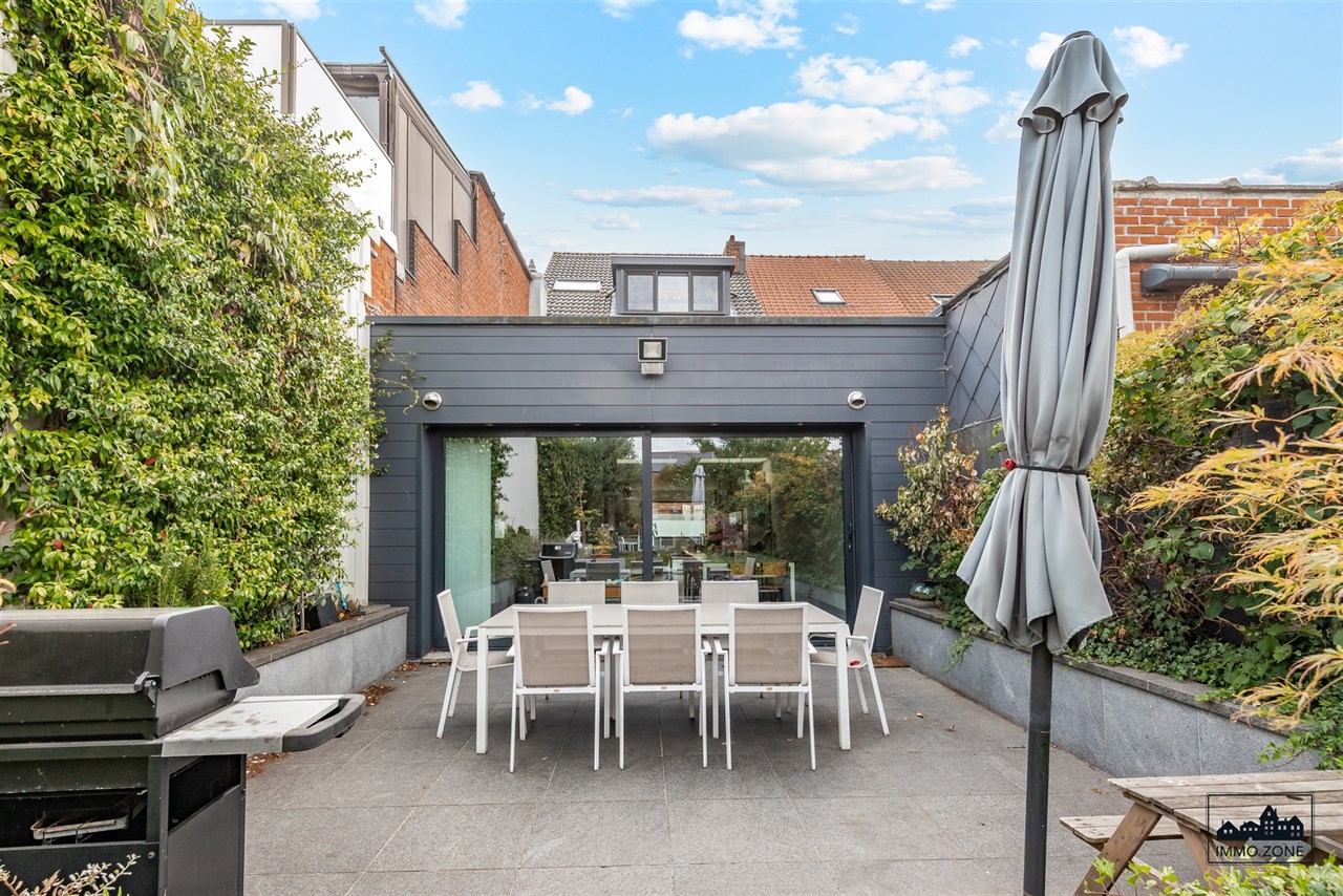 -Vanuit de inkomhal leidt een elegante glazen schuifdeur naar de open leefruimte van maar liefst 20m diep. De ruimte omvat vooraan een multifunctionele zone (ideaal als bureau of speelhoek), centraal een gezellige zithoek en achteraan een lichtrijke keuken met eetplaats. Een grote glaspartij biedt zicht op de wintergroene, gezellige stadstuin met ruim terras in graniet en tuinlounge achterin de tuin. Een gastentoilet en aparte berging bevinden zich centraal op het gelijkvloers.