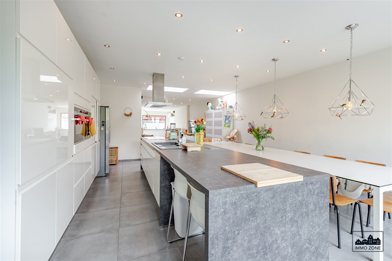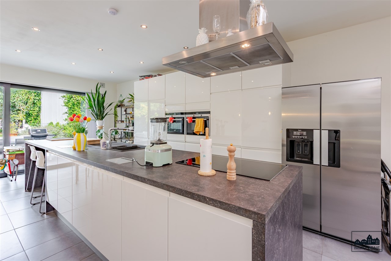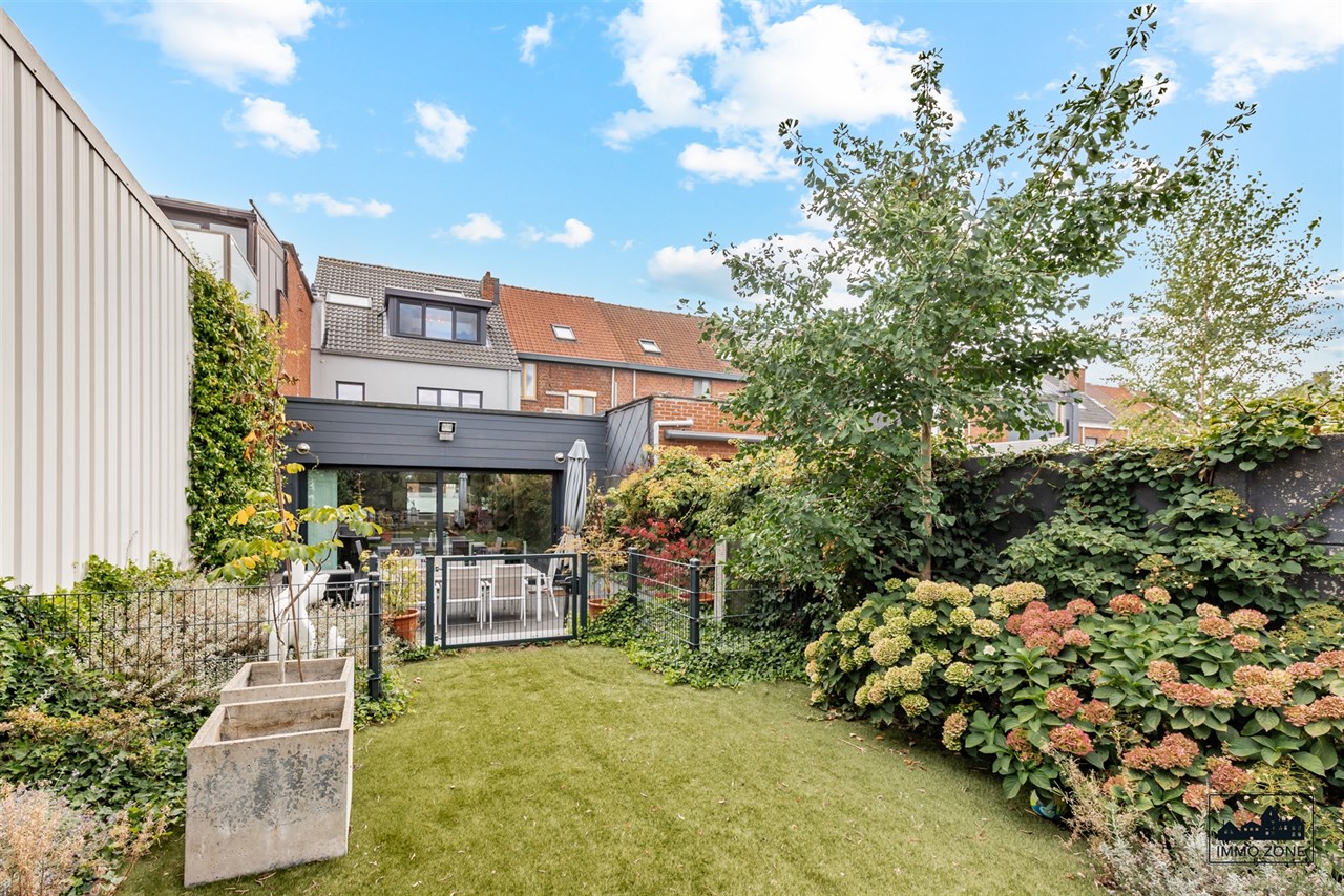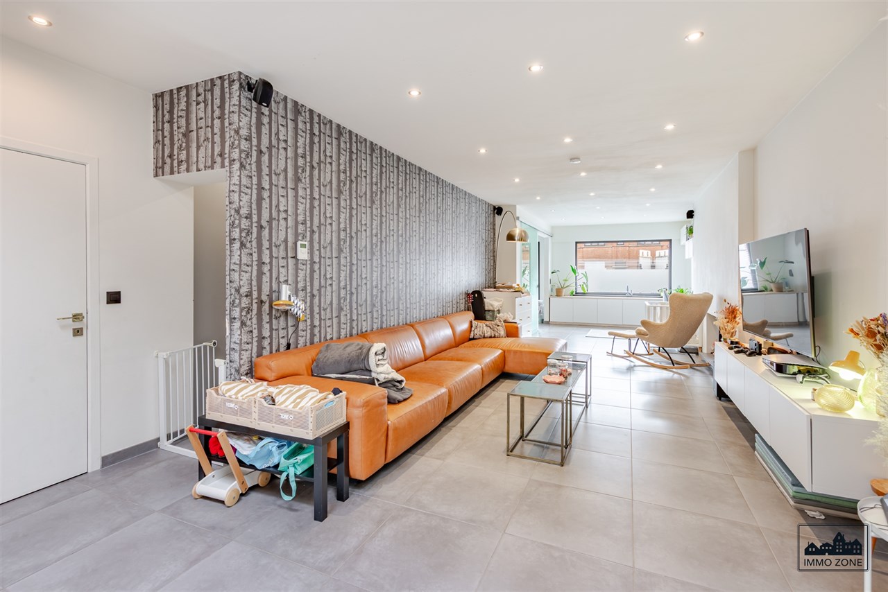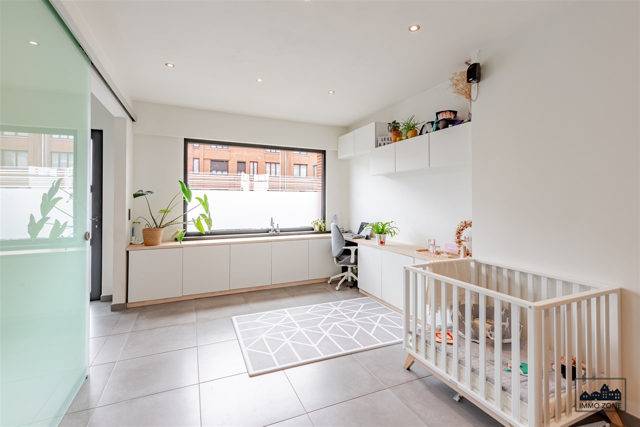 -Vanuit de inkomhal leidt een elegante glazen schuifdeur naar de open leefruimte van maar liefst 20m diep. De ruimte omvat vooraan een multifunctionele zone (ideaal als bureau of speelhoek), centraal een gezellige zithoek en achteraan een lichtrijke keuken met eetplaats. Een grote glaspartij biedt zicht op de wintergroene, gezellige stadstuin met ruim terras in graniet en tuinlounge achterin de tuin. Een gastentoilet en aparte berging bevinden zich centraal op het gelijkvloers.