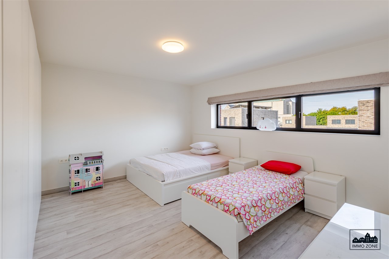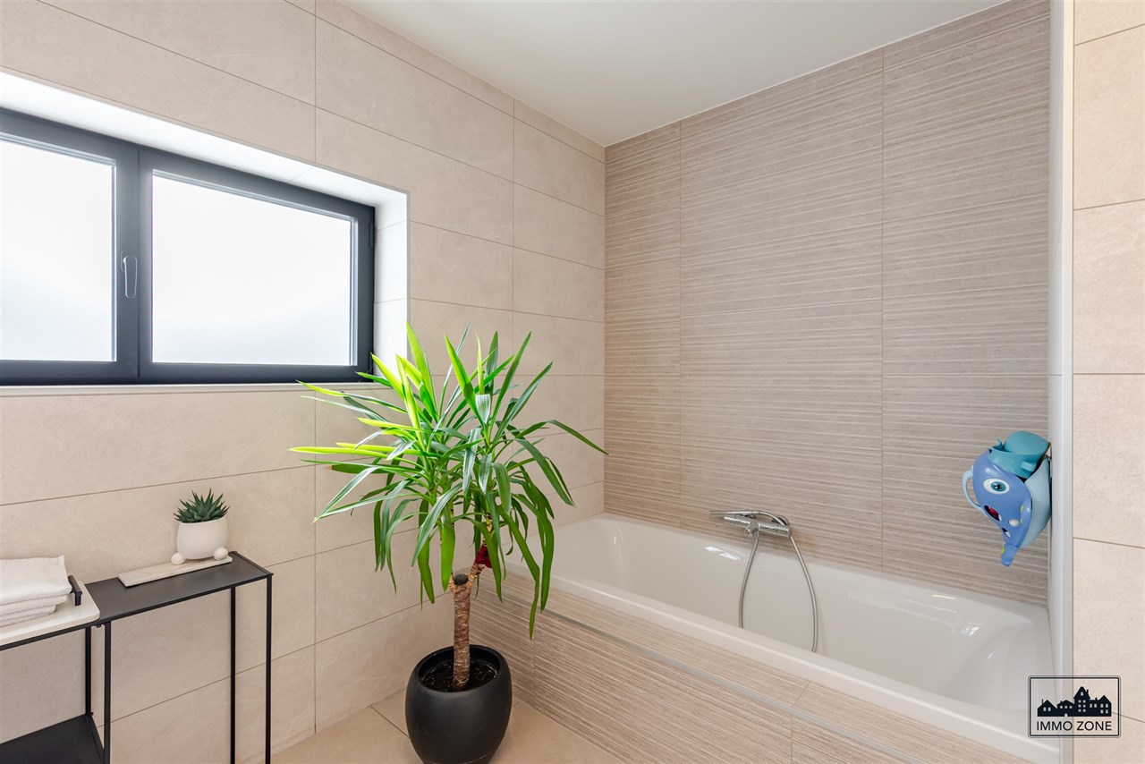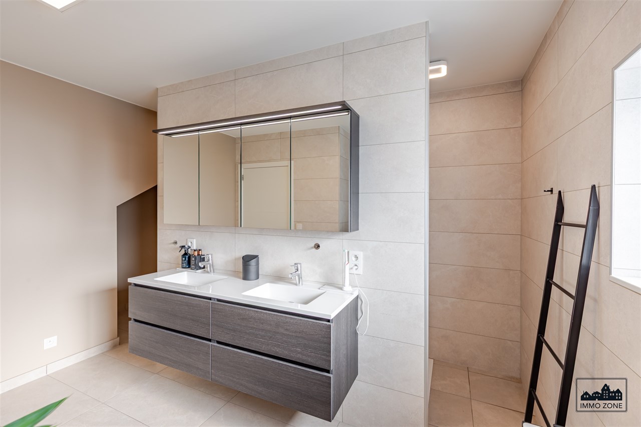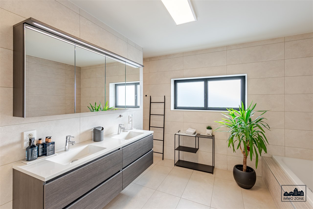 Op de eerste verdieping vinden we 2 ruime kinderkamers, een masterbedroom met dressing én een badkamer met dubbele lavabo, ligbad, douche en toilet.