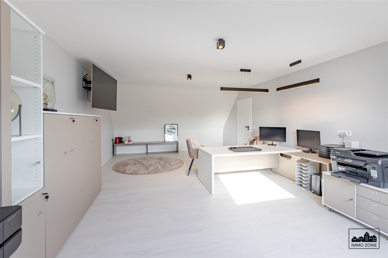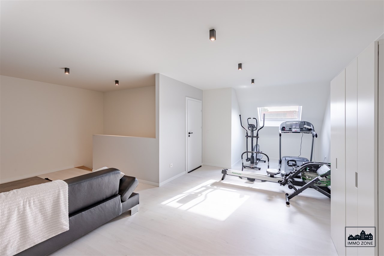 De vaste trap brengt u tot de prachtig afgewerkte zolder verdieping die kan dienst doen als ontspanningsruimte, bureau, slaapkamer of de mogelijkheid tot 2 slaapkamers. Er is nog de mogelijkheid om een extra badkamer te voorzien op de zolder, de leidingen liggen al klaar.